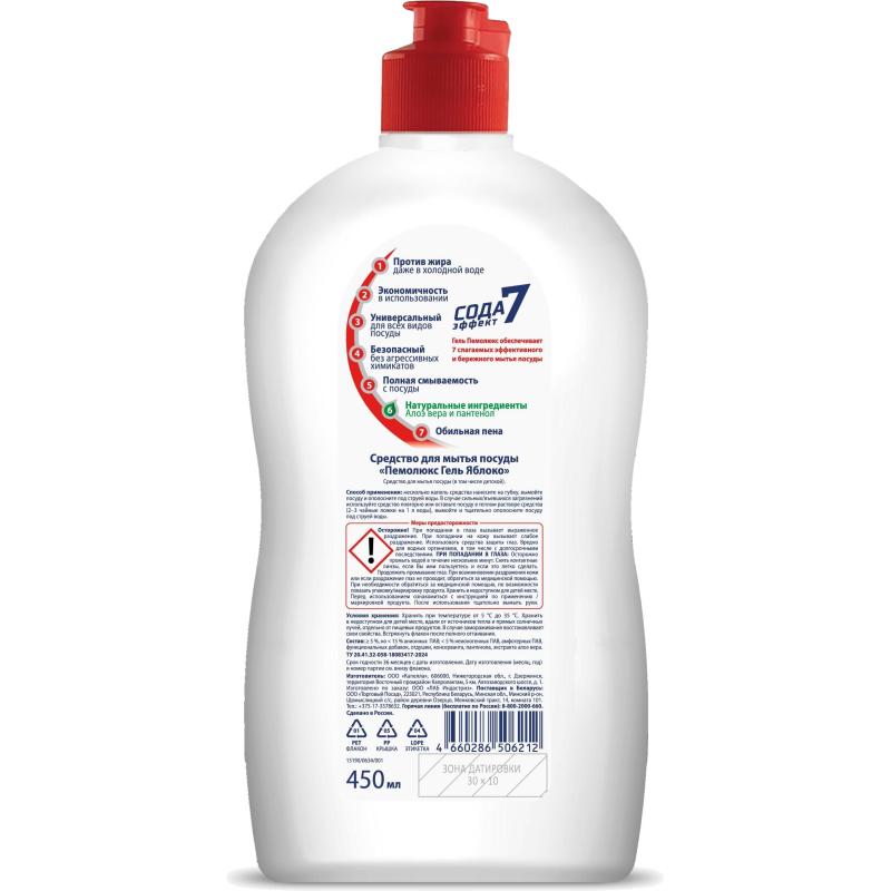 Средство для мытья посуды Пемолюкс Яблоко 0.45 л<br><br><b>Назначение:</b>средство подходит для всех типов посуды, в том числе детской. Гель обеспечивает 7 слагаемых эффективного и бережного мытья посуды:<br>1. Эффективен против жира даже в холодной воде.<br>2. Экономичен в использовании.<br>3. Универсален для всех типов посуды.<br>4. Безопасен, не содержит агрессивных химикатов.<br>5. Полностью смывается с посуды.<br>6. Натуральные ингредиенты — алоэ вера и пантенол.<br>7. Обильная пена.<br>Средство обладает приятным ароматом яблока.<br><b>Способ применения:</b>нанесите несколько капель средства на губку, вымойте посуду и ополосните под струёй воды. В случае сильных/въевшихся загрязнений используйте средство повторно или замочите посуду в тёплом растворе средства (2-3 чайные ложки на 1 л воды), вымойте и тщательно ополосните посуду под струёй воды.<br><b>Меры предосторожности</b> осторожно! При попадании в глаза вызывает сильное раздражение. При попадании на кожу вызывает слабое раздражение. Использовать средства защиты глаз. Вредно для водных организмов. При попадании в глаза: осторожно промыть водой в течение нескольких минут. Снять контактные линзы, если Вы ими пользуетесь, и если это легко сделать, продолжить промывание. При необходимости обратиться за медицинской помощью. Хранить в недоступном для детей месте. После использования тщательно вымыть руки.<br><b>Состав:</b>5%, но < 15 % анионных ПАВ; < 5 % неионогенных ПАВ, амфотерных ПАВ, функциональных добавок, отдушки, консерванта, пантенола, экстракта алоэ вера.<br><b>Условия хранения:</b>хранить при температуре от 5°С до 35°С. Хранить в недоступном для детей месте, вдали от источников тепла и прямых солнечных лучей, отдельно от пищевых продуктов. В случае замораживания восстанавливается.<br><b>Срок годности:</b>3 года с даты изготовления (дату изготовления см. на упаковке).