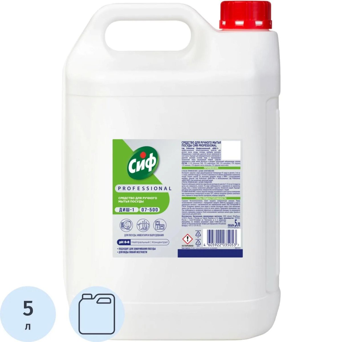 <b>Назначение:</b> средство для мытья посуды Сиф Professional ДИШ-1 предназначено для ручного мытья посуды, столовых приборов, кухонного оборудования и инвентаря, удаления лёгких загрязнений в зоне кухни, подходит для предварительного замачивания и удаления засохших остатков пищи и масложировых загрязнений перед последующей мойкой.<br><b>Способ применения:</b><br>С разбавлением: растворите средство в воде из расчёта 13 мл на 1 л воды средней и мягкой жёсткости, замочите посуду на 3-30 минут в зависимости от степени загрязнения посуды. Дозировка может быть увеличена до 15 мл в регионах с повышенной жёсткостью воды. По окончании замачивания вымойте посуду.<br>Без разбавления: нанесите небольшое количество средства (1 каплю) на губку, салфетку или щётку, потрите посуду. По мере необходимости добавляйте средство на губку в зависимости от количества посуды, типа и степени загрязнения. Ополосните посуду водой.<br><b>Меры предосторожности:</b> перед использованием ознакомиться с маркировкой продукта. Избегать попадания в глаза и длительного контакта с чувствительной или повреждённой кожей. После работы тщательно вымыть руки. <br><b>Состав: 5-15% анионные ПАВ, <5% амфотерные ПАВ, <5% консервант, <5% отдушка, <5% лимонен, <5% эфирное масло апельсина, <5% эфирное масло мяты. Содержит бензоизотиазолинон.<br><b>Условия хранения:</b> хранить в плотно закрытой упаковке изготовителя в сухих крытых помещениях при положительных температурах не выше +30°С, избегая попадания прямого солнечного света, отдельно от лекарственных препаратов, пищевых продуктов. Хранить в недоступном для детей месте.<br><b>Срок годности:</b> 36 месяцев с даты изготовления (дату изготовления см. на упаковке).