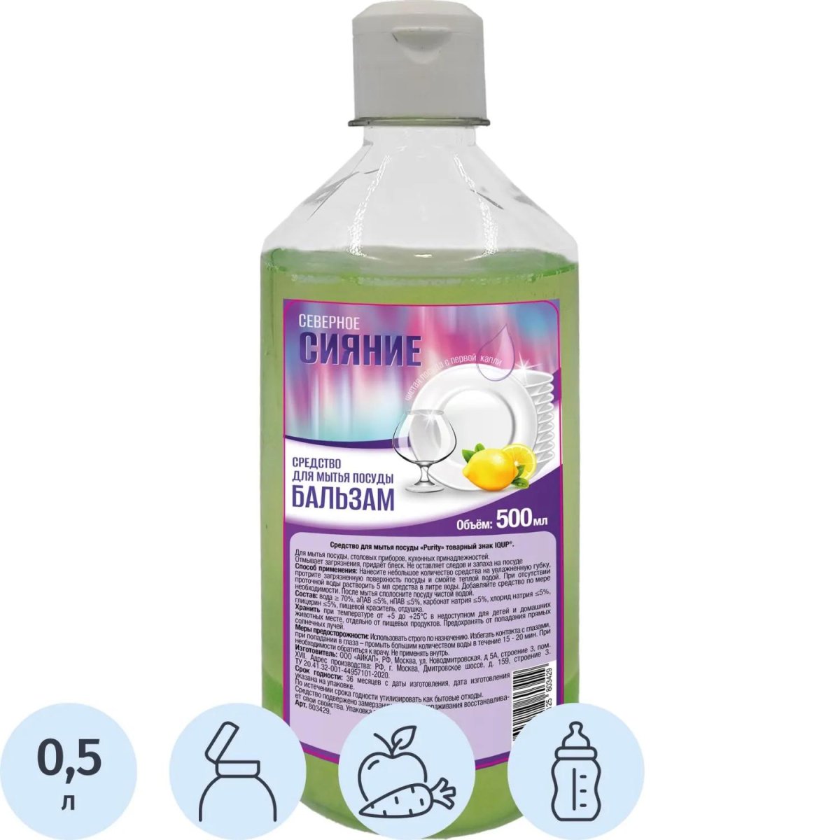 Средство для мытья посуды IQUP Северное сияние Лимон жидкость 0.5 л<br><br><b>Назначение:</b> гель предназначен для мытья посуды, столовых приборов, кухонных принадлежностей, поверхностей кухонной мебели, пищевого технологического оборудования, тары и пищевого инвентаря.<br>Область применения в быту и местах общественного пользования, на предприятиях пищевой промышленности, в школах, дошкольных и медицинских учреждениях. Легко отмывает загрязнения с посуды, придаёт блеск, бережно относится к коже рук и очищаемым поверхностям. Полностью смывается водой. Не оставляет следов и запаха. Не содержит фосфатов. Не имеет резкого запаха.<br><b>Способ применения:</b> для мытья посуды нанесите небольшое количество геля на увлажнённую губку, протрите загрязнённую поверхность посуды и смойте тёплой водой. При отсутствии проточной воды растворите 5 мл средства в литре воды. Добавляйте средство по мере необходимости. После мытья сполосните посуду чистой водой.<br><b>Меры предосторожности:</b> использовать строго по назначению в пределах срока годности. Избегать контакта с глазами, при попадании в глаза — промыть большим количеством чистой воды в течение 15-20 мин. При необходимости обратиться к врачу. Не применять внутрь.<br><b>Состав:</b> вода ≥ 70%, аПАВ ≤5%, нПАВ ≤5%, карбонат натрия ≤5%, хлорид натрия ≤5%, глицерин ≤5%, пищевой краситель, отдушка.<br><b>Условия хранения:</b> хранить при температуре от +5 до +25°C в недоступном для детей и домашних животных месте, отдельно от пищевых продуктов. Предохранять от попадания прямых солнечных лучей.<br><b>Срок годности:</b> 36 месяцев с даты изготовления (дату изготовления см. на упаковке)<br>Содержимое флакона 500 мл.