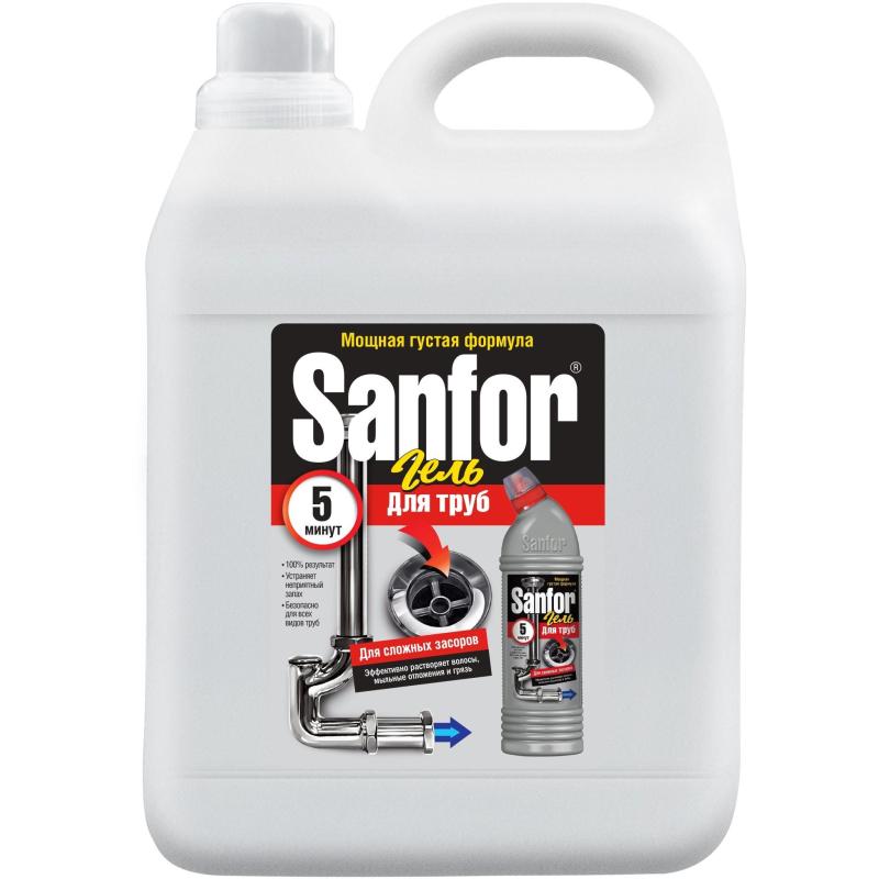 <b>Средство для прочистки труб Sanfor гель 5 л</b><br> <br> Предназначено для очистки и профилактического ухода за канализационными трубами. Густой гель быстро устранит даже очень сильные засоры в канализационных стоках. Результат достигается уже за 5 минут. Благодаря густой структуре проникает глубоко в трубу непосредственно к засору даже при наличии воды. Эффективно растворяет в стоках волосы, остатки пищи, жир и другие загрязнения. Нейтрализует неприятные запахи. Средство безопасно для всех видов труб, в том числе пластиковых. Обладает антимикробными свойствами. Убивает микробы за 30 минут.<br> <b>Способ применения:</b><br> Аккуратно налить гель (250 мл) в сливное отверстие канализационной трубы. Не смывать в течение 5-15 минут. При сильных засорах оставить на большее время. Промыть сильной струей воды. При необходимости обработку повторить.<br> Профилактика: обработку проводить 1 раз в месяц. Для достижения антибактериального эффекта увеличить время воздействия до 30 минут.<br> <b>Состав:</b> ≥ 5 %, но < 15 % гипохлорит натрия; < 5 %: АПАВ или мыло на основе натуральных жирных кислот, НПАВ, щелочь, соль ЭДТА.<br> <b>Меры предосторожности:</b><br> Осторожно. При попадании на кожу вызывает раздражение. При попадании в глаза может вызывать необратимые последствия. Чрезвычайно токсично для водных организмов, в том числе с долгосрочными последствиями. Использовать резиновые перчатки. При попадании на кожу — промыть большим количеством воды. При попадании в глаза — осторожно промыть водой в течение нескольких минут. При необходимости обратиться за медицинской помощью.<br> <b>Условия хранения:</b><br> Хранить в плотно закрытой упаковке изготовителя в недоступном для детей месте, отдельно от пищевых продуктов. Беречь от солнечных лучей. Не смешивать с другими средствами бытовой химии. Средство замерзает, после размораживания сохраняет свои свойства. В бытовых условиях упаковку и, при необходимости, средство утилизировать как бытовой отход.<br> <b>Срок годности:</b> 24 месяца.