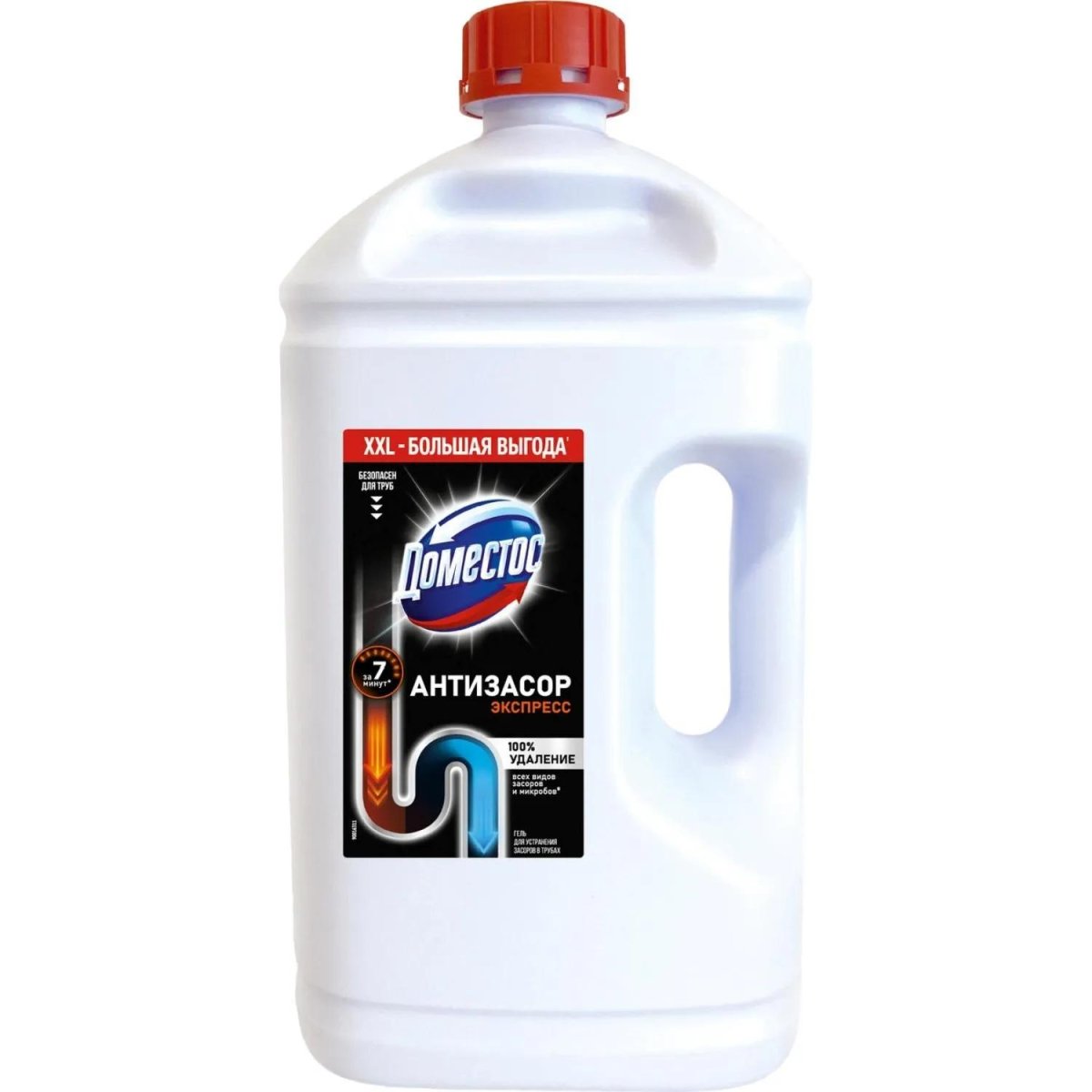 <b>Назначение:</b> средство для прочистки труб Доместос Антизасор предназначено для устранения засоров, неприятных запахов в трубах.<br><b>Способ применения:</b> все виды засоров в ванной (волосы, мыльный налёт и т.п.): вылейте 250-350 мл средства в стоячую воду или сток, оставьте на 7-15 минут. Как только сток полностью прочистится и вода уйдёт, тщательно смойте остатки средства и загрязнения тёплой водой. Засоры на кухне (жировые, белковые (мясо, яйца, рыба), углеводные (макароны, хлопья), овощи (кожура овощей) и т.п.): вылейте 500-750 мл средства в стоячую воду или сток, оставьте на 10-30 минут, при сложных засорах до 2-х часов, до полной прочистки. Как только сток полностью прочистится и вода уйдёт, тщательно смойте остатки средства и загрязнения тёплой водой.<br>В целях профилактики засоров заливайте 250-350 мл Доместос в сливное отверстие на 15 минут раз в неделю или при необходимости чаще.<br><b>Меры предосторожности:</b> перед использованием ознакомиться с маркировкой продукта. Содержит хлорактивный компонент. Использовать перчатки и средства защиты лица и глаз. Использовать только в хорошо вентилируемом помещении. Не вдыхать пары. После использования тщательно вымыть руки и лицо. При попадании на кожу вызывает раздражение. При попадании на кожу (или волосы): Промыть большим количеством воды. При возникновении раздражения обратиться за медицинской помощью. Снять всю загрязнённую одежду и выстирать перед повторным использованием. При попадании в глаза вызывает необратимые последствия. При попадании в глаза: Осторожно промыть глаза водой в течение нескольких минут. Снять контактные линзы, если Вы ими пользуетесь, и если это легко сделать. Продолжить промывание глаз. Немедленно обратиться за медицинской помощью. Локализовать проливы во избежание воздействия. Чрезвычайно токсично для водных организмов. Токсично для водных организмов с долгосрочными последствиями. Хранить в недоступном для детей месте. Может вызывать коррозию металлов. Не используйте на металлических поверхностях с эмалированным, золотым или хромированным покрытием. Не допускайте попадания на ткань, мебель, обивку, ковры, так как они могут быть повреждены. В случае попадания Доместос на эти поверхности протрите их и тщательно промойте водой. Не смешивайте с другими средствами во избежание образования опасного газа (хлора). <br><b>Состав:</b> <5% гипохлорит натрия, <5% неионогенные ПАВ, <5% мыло.<br><b>Условия хранения:</b> хранить в сухом защищённом месте без воздействия прямых солнечных лучей при температуре от +5°С до +25°С.<br><b>Срок годности:</b> 18 месяцев с даты изготовления (дату изготовления см. на упаковке).