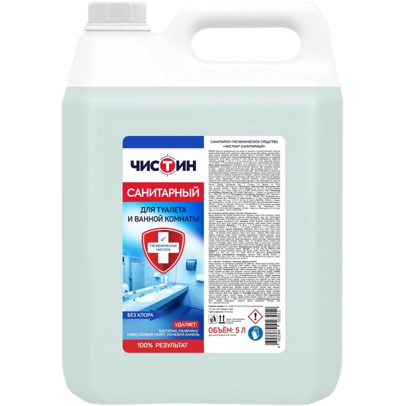 Средство для сантехники чистящее Чистин Санитарный 5 л для уборки туалета и ванной<br><br><b>Назначение:</b> средство предназначено для ухода за туалетом и ванной комнатой. Эффективно удаляет известковый налёт и ржавчину с фаянсовых санитарных изделий, кафеля, душевых кабин, душа и кранов. Идеально растворяет мочевой камень в унитазах, уничтожает бактерии и обеспечивает свежий запах.<br><b>Способ применения:</b> нанести средство на очищаемую поверхность, выдержать 10–20 минут, затем почистить и смыть водой. При необходимости обработку повторить.<br><b>Состав:</b> ≥5%, но <15% смесь кислот (в том числе щавелевая кислота); <5% н-ПАВ; <5% ингибитор коррозии; <5% краситель; <5% ароматизирующая добавка.<br><b>Меры предосторожности:</b> осторожно! При попадании в глаза или на кожу вызывает раздражение. Использовать щётку или резиновые перчатки.<br>При попадании на кожу: промыть большим количеством воды. При попадании в глаза: осторожно промыть водой в течение нескольких минут, при необходимости обратиться за медицинской помощью. Не смешивать с другими чистящими средствами. Не использовать для чистки поверхностей, чувствительных к кислотам (мрамор, акрил, эмаль, нержавеющая сталь).<br><b>Условия хранения:</b> хранить в плотно закрытой упаковке, в недоступном для детей месте, отдельно от пищевых продуктов. Средство замерзает, после размораживания сохраняет свои свойства. В бытовых условиях упаковку и остатки средства утилизировать как бытовой отход.<br><b>Срок годности:</b> 24 месяца с даты изготовления (дату изготовления см. на упаковке).<br>