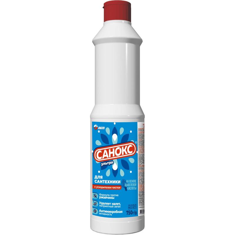 Средство для сантехники чистящее Санокс Ультра 0,75 кг для уборки туалета и ванной<br><br><b>Назначение:</b> средство предназначено для чистки раковин, унитазов, кафеля и другого сантехнического оборудования от ржавчины, известковых отложений, жировых и прочих загрязнений.<br><b>Способ применения:</b> равномерно распределить средство по загрязнённой поверхности унитаза (предварительно смоченной водой), включая область под ободком. Оставить на 3–5 минут, почистить щёткой, затем смыть водой. Для чистки других сантехнических изделий и поверхностей растворить 20–30 г средства в 1 литре воды.<br><b>Меры предосторожности:</b> осторожно, содержит щавелевую кислоту! При попадании в глаза и/или на кожу промыть большим количеством воды, при необходимости обратиться к врачу. Беречь от детей. Хранить вдали от пищевых продуктов. Не смешивать с другими средствами бытовой химии. При применении использовать резиновые перчатки. Не использовать для чистки чувствительных к действию кислот или повреждённых поверхностей. Перед применением опробовать на небольшом участке.<br><b>Состав:</b> <5% неионогенные ПАВ, сульфаминовая кислота, ароматизатор, краситель; 5–15% анионные ПАВ, щавелевая кислота.<br><b>Условия хранения:</b> хранить в крытых вентилируемых складских помещениях при температуре от −5°C до +30°C и относительной влажности воздуха не более 95%.<br><b>Срок годности:</b> 18 месяцев с даты изготовления (дату изготовления см. на упаковке).