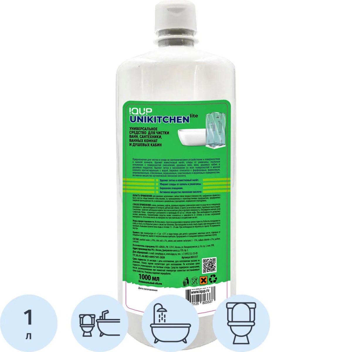 Средство для сантехники моющее/чистящее Unikitchen lite IQUP 1 л для уборки ванн и душевых/для уборки туалета<br><br>Назначение: кислотное моющее и чистящее средство предназначено для санитарной обработки сантехнических устройств, ванн, душевых, кафеля, плитки, наливных полов, унитазов, раковин, писсуаров и душевых поддонов, включая акриловые поверхности. Эффективно удаляет известковый и мыльный налёт, следы ржавчины, грязь и пыль. Подходит для твёрдых поверхностей из фаянса, керамики, нержавеющей стали, пластика, стекла, эмали, фарфора и камня. Средство применяется в бытовых помещениях, на промышленных предприятиях, объектах общественного пользования, а также разрешено для использования в детских учреждениях. Не содержит хлора.<br><br><b>Способ применения:</b> нанести средство на очищаемую поверхность, при необходимости потереть щёткой или губкой, оставить на 5–7 минут, затем смыть водой. При сильных загрязнениях оставить на 10–15 минут.<br>Рекомендуется использовать перчатки.<br>Не применять на поверхностях, чувствительных к кислотам (мрамор, натуральный камень и т.д.).<br><br><b>Меры предосторожности:</b> использовать по назначению. При длительном применении использовать резиновые перчатки. Избегать попадания в глаза. При попадании в глаза — осторожно промыть большим количеством воды. При необходимости обратиться к врачу. Хранить в недоступном для детей месте, отдельно от пищевых продуктов и кормов.<br><br><b>Состав:</b> очищенная вода ≥ 20%; органические кислоты ≤ 20%; неионогенные ПАВ ≤ 15%; отдушка ≤ 5%; краситель ≤ 0.5%.<br><br><b>Условия хранения:</b> при температуре от +5 °С до +25 °С в герметично закрытой упаковке. Избегать попадания прямых солнечных лучей. Беречь от замерзания.<br><br><b>Срок годности:</b> 36 месяцев с даты изготовления (дату изготовления см. на упаковке).