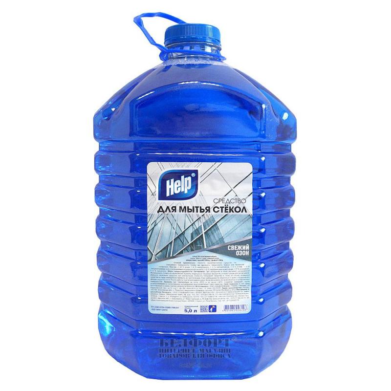 Средство для мытья стёкол и зеркал Help Свежий озон 5 л<br><br><b>Назначение.</b> Эффективное средство для мытья стёкол, окон, зеркал. Удаляет пятна. Смывает грязь, следы от пальцев. Защищает от пыли и придаёт блеск. Не оставляет разводов.<br><b>Способ применения.</b> Нанесите средство на рекомендуемую поверхность. Вытрите поверхность тканью, не оставляющей ворсинок. Не используйте на необработанных деревянных и полированных поверхностях.<br><b>Меры предосторожности.</b> При попадании в глаза сразу промойте водой, при проглатывании обратитесь к врачу и покажите упаковку.<br><b>Состав.</b> Больше или равно 30% вода, больше или равно 5%, но < 15% изопропанол, < 5% этиленгликоль, < 5% парфюмерная композиция, < 5% АПАВ, < 5% тетранатриевая моль этилендиаминтетрауксусной кислоты, < 5% краситель.<br><b>Условия хранения.</b> Хранить при температуре не ниже −20°C и не выше +30°C в сухом не доступном для детей месте.<br><b>Срок годности.</b> 5 лет с даты изготовления (дату изготовления см. на упаковке).