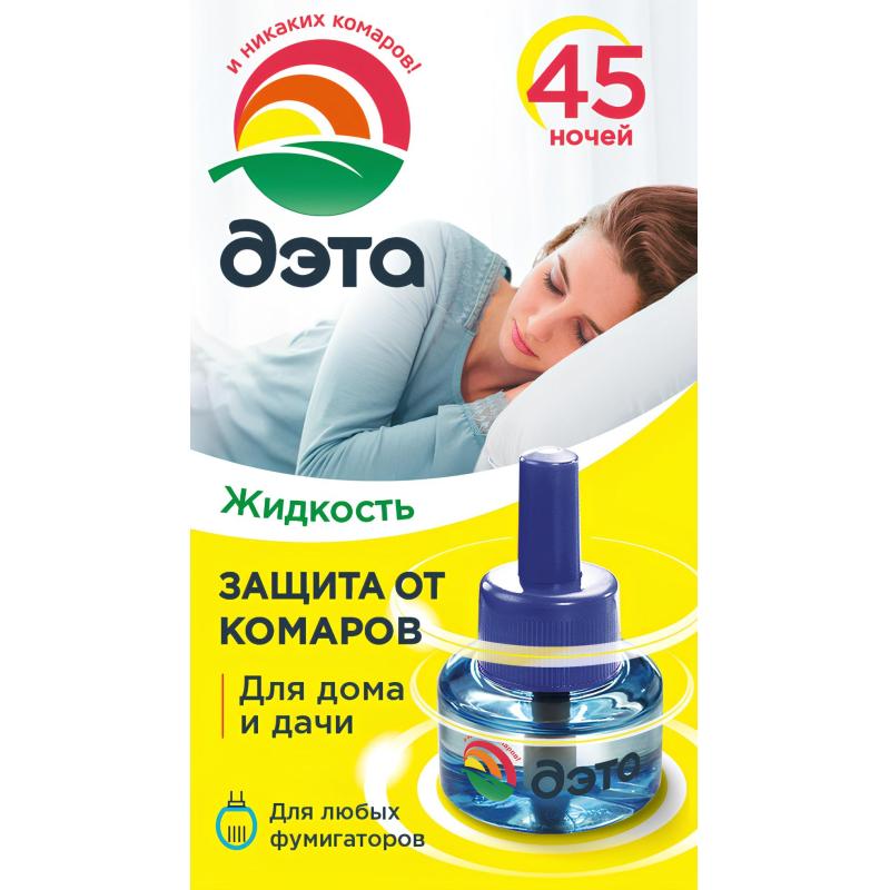 <b>Средство от насекомых Дэта жидкость для фумигатора от комаров/москитов/мошек 30 мл</b><br><br><b>Назначение:</b> Жидкость предназначена для уничтожения комаров и других летающих насекомых — москитов и мошек в помещениях. Специально разработанная рецептура не имеет запаха и обеспечивает безопасность и эффективность использования. Один флакон гарантирует надёжную защиту от комаров на протяжении 45 ночей, даже при открытых окнах. Максимальный эффект достигается при использовании жидкости совместно с фумигатором Дэта.<br><br><b>Способ применения:</b> Извлеките из упаковки флакон с раствором, снимите защитный колпачок, вверните флакон в нагреватель до упора и подключите прибор к электросети 220 В, при этом флакон должен находиться в вертикальном положении. Полное уничтожение комаров происходит менее чем за 1 час. При открытых окнах или форточках электрофумигатор с флаконом можно оставлять включённым на всю ночь. По окончании работы нагреватель выключите, флакон вывинтите, закройте защитным колпачком и сохраните для следующего использования. Один флакон объёмом 30 мл рассчитан примерно на 360 часов работы.<br><br><b>Меры предосторожности:</b> Применяйте средство только по назначению. Используйте его в отсутствие людей при закрытых окнах или форточках, после чего обязательно проветривайте помещение не менее 30 минут. В присутствии людей применяйте средство только при открытых окнах или форточках, размещая прибор на расстоянии не менее 1 метра от места постоянного пребывания человека. Устанавливайте устройство в местах, недоступных детям, вне контакта с посторонними предметами обихода. Используйте средство в помещениях площадью не менее 13 м². Не касайтесь рукой или металлическими предметами нагревательной поверхности и стержня, избегайте попадания воды и прямых солнечных лучей на флакон. Выключайте нагреватель из розетки, когда он не используется. При появлении признаков дискомфорта прекратите использование средства, выключите прибор и проветрите помещение не менее 30 минут. При возникновении неприятных ощущений во рту (горечь, сухость) прополощите рот 2% раствором пищевой соды.<br><br><b>Состав:</b> праллетрин, растворитель, стабилизатор.<br><br><b>Условия хранения:</b> Храните средство в упаковке, отдельно от пищевых продуктов, в местах, недоступных детям и домашних животных. Защищайте средство от прямых солнечных лучей и нагрева, размещайте на расстоянии не менее 1 метра от нагревательных приборов. Температурный режим хранения — от +5°C до +30°C.<br><br><b>Срок годности:</b> 5 лет с даты изготовления.
