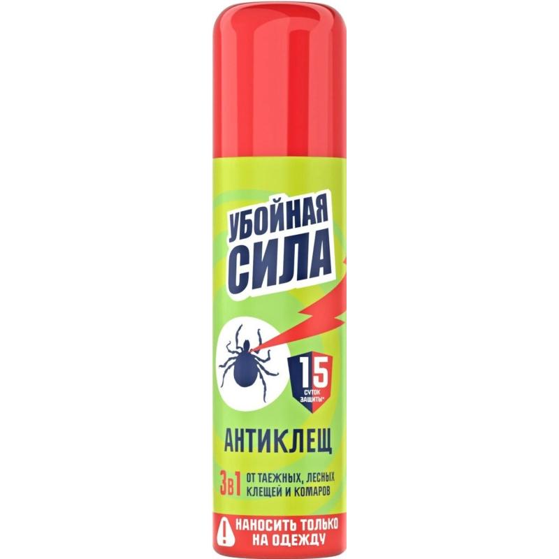 <b>Средство от насекомых Убойная cила Антиклещ аэрозоль от клещей/комаров/блох 150 мл</b> <br><br><b>Назначение:</b> Средство предназначено для защиты от таёжных, лесных и иксодовых клещей. Оно эффективно при применении на одежде для предотвращения укусов клещей.<br><br><b>Способ применения:</b> Перед применением упаковку необходимо встряхнуть в течение 2-3 секунд. Обрабатывайте одежду на открытом воздухе (вне помещений), располагая её так, чтобы струя средства направлялась по направлению ветра. Распылите средство на одежду с расстояния 20-25 см. Особое внимание следует уделить обработке брюк, особенно в области щиколоток, голеней, коленей, бёдер и в местах возможного проникновения клещей и блох к телу. После обработки одежду просушите и наденьте на нижнее бельё. Повторную обработку рекомендуется проводить через 10-15 суток или после стирки одежды. Средство защищает от клещей и блох до 15 суток, а от летающих насекомых — до 10 суток, при условии, что одежда хранится в закрытом полиэтиленовом пакете. Нарушение способа применения может привести к присасыванию клещей, поэтому соблюдайте инструкции внимательно.<br><br><b>Меры предосторожности:</b> Использовать средство следует только по назначению, согласно инструкции. Средство является огнеопасным и находится под давлением. Не распыляйте его вблизи открытого огня или раскалённых предметов. Не разбирайте баллон и не давайте его детям. Не обрабатывайте одежду на человеке. Для одного человека не рекомендуется использовать более 300 мл средства в сутки. Одежду для детей, беременных и кормящих женщин обрабатывают только другие лица. Лицам с заболеваниями кожи и повышенной чувствительностью к химическим веществам следует применять средство с осторожностью. Одежду, обработанную средством, не следует надевать до полного высыхания. При попадании средства в глаза или на кожу — промойте их водой. В случае попадания в органы дыхания — выйдите на свежий воздух. При необходимости обратитесь к врачу. После работы с препаратом тщательно вымойте руки с мылом. <br><br><b>Состав:</b> альфациперметрин (0,2%), N,N-диэтилтолуамид (5,0%); <5%: отдушка, триэтиленгликоль; ≥30%: пропеллент углеводородный (пропан, бутан, изобутан), этиловый спирт денатурированный (53,7% об.). Не содержит озоноразрушающих веществ.<br><br><b>Условия хранения:</b> Храните средство при температуре от −25°C до +30°C, отдельно от пищевых продуктов, в недоступном для детей месте. Не используйте средство по истечении срока годности. Утилизируйте средство как бытовой отход.<br><br><b>Срок годности:</b> 5 лет с даты изготовления.