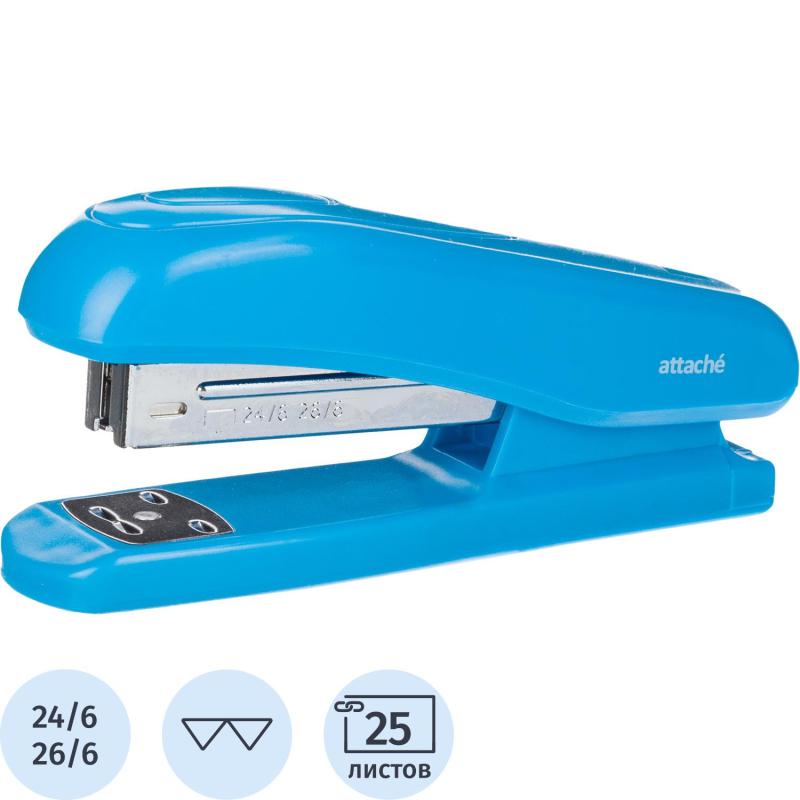 Степлер Attache (Attache Economy) до 25 листов синий (скобы № 24/6, 26/6)<br><br>Степлер Attache (Attache Economy) одновременно сшивает до 25 листов плотностью 80 г/кв.м. Позволяет производить сшивание закрытым и открытым способом. Глубина закладки бумаги — 60 мм. Корпус выполнен из металла и пластика, цвет синий. В степлере используются скобы № 24/6, 26/6. Вместимость скоб № 26/6 — 100 штук, № 24/6 — 50 штук. Размер: 127×35×55 мм. Для эффективного сшивания максимально допустимого объёма бумаги необходимо расположить степлер на горизонтальной твёрдой поверхности, прикладывая усилия, плавно надавить на рычаг (при необходимости двумя руками), разномерно распределяя усилия по поверхности рычага.<br>В рамках ребрендинга производится перевод данного артикула с ТМ Attache Economy на ТМ Attache с сохранением всех потребительских характеристик товара. На переходный период допускается поставка данной продукции в двух вариантах дизайна.