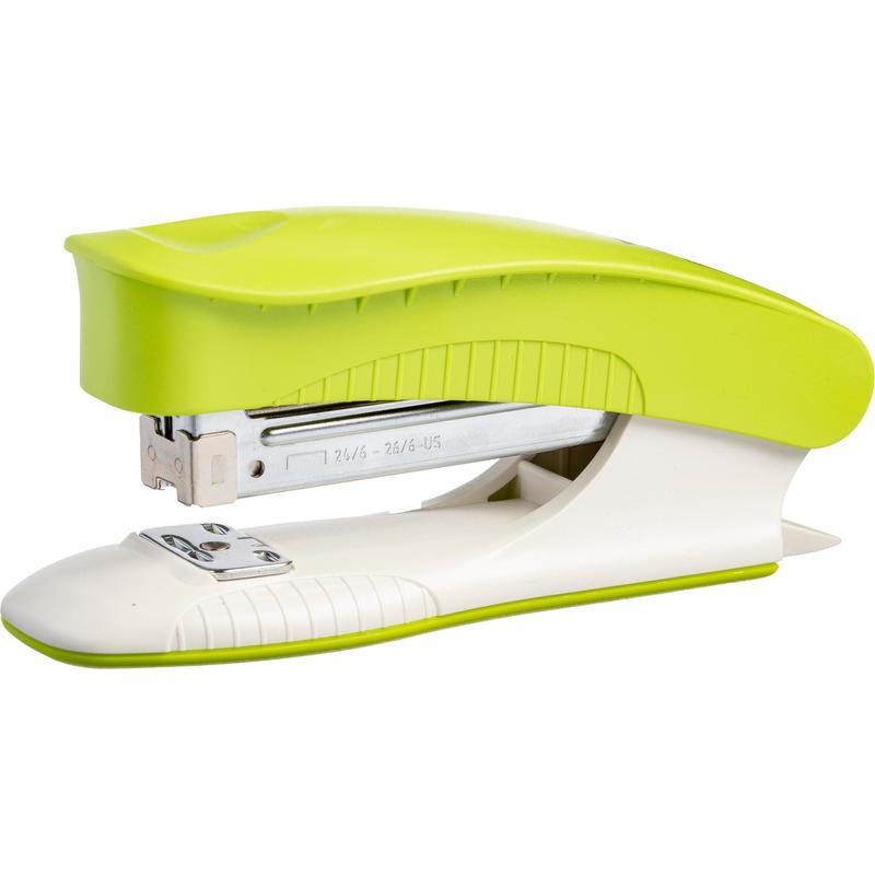 Степлер Комус PSG2425 выполнен в пластиковом корпусе зеленого цвета. Рабочие компоненты изготовлены из высококачественной стали. Степлер совместим со скобами №№ 24/6-26/6, одновременно сшивая до 25 листов бумаги плотностью до 80 г/кв.м. Модель оснащена антистеплером, механизмом быстрой загрузки скоб, индикатором наполненности лотка для скоб. Степлер сшивает как закрытым, так и прямым типом сшивания. Закрытый тип сшивания, при котором ножки скобы загибаются внутрь, дает возможность надежно хранить сшитые документы на протяжении длительного времени. Прямой тип сшивания, при котором ножки скобы не загибаются, позволяет прикреплять объявления или документы к мягкой поверхности, например к пробковой доске. Для этого достаточно раскрыть степлер на 180 градусов и закрепить документ. Вместимость лотка для скоб: 50 скоб размером № 24/6 или 100 скоб размером 26/6. Глубина закладки бумаги: 60 мм. Обращаем внимание, что для эффективной работы изделия давление необходимо направлять в зону углубления, расположенной в верхней части степлера над зоной подачи скоб. Степлер при этом эффективно работает как на весу, так и на горизонтальной поверхности. При нажатии на центральную часть степлера скоба сгибаться не будет.<br> Для эффективного сшивания максимально допустимого объема бумаги необходимо расположить степлер на горизонтальной твердой поверхности, прикладывая усилия, плавно надавить на рычаг (при необходимости двумя руками), разномерно распределяя усилия по поверхности рычага.