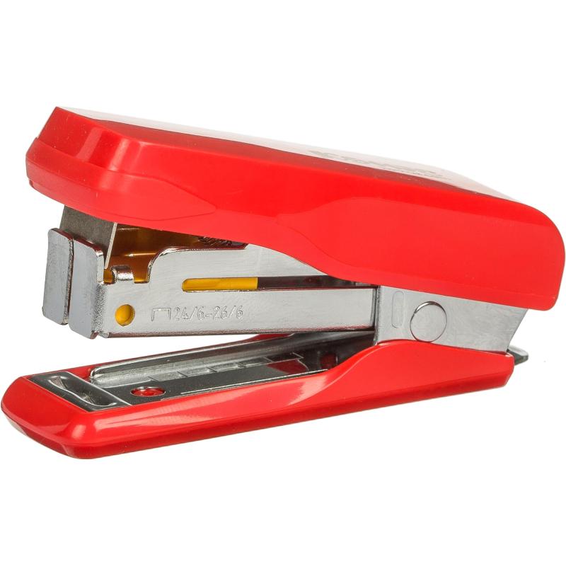 Степлер Комус выполнен в металлическом корпусе красного цвета. Рабочие компоненты изготовлены из высококачественной стали. Степлер совместим со скобами № 24/6-26/6, одновременно сшивая до 20 листов бумаги плотностью до 80 г/кв.м. Модель оснащена антистеплером, механизмом быстрой загрузки скоб и индикатором наполненности лотка для скоб, что делает ее очень удобной в применении. Степлер сшивает как закрытым, так и прямым типом сшивания. Закрытый тип сшивания, при котором ножки скобы загибаются внутрь, дает возможность надежно хранить сшитые документы на протяжении длительного времени. Прямой тип сшивания, при котором ножки скобы не загибаются, позволяет прикреплять объявления или документы к мягкой поверхности, например к пробковой доске. Для этого достаточно раскрыть степлер на 180 градусов и закрепить документ. Вместимость лотка для скоб: 50 скоб размером № 24/6 или № 26/6. Глубина закладки бумаги: 27 мм.<br> Для эффективного сшивания максимально допустимого объема бумаги необходимо расположить степлер на горизонтальной твердой поверхности, прикладывая усилия, плавно надавить на рычаг (при необходимости двумя руками), разномерно распределяя усилия по поверхности рычага.