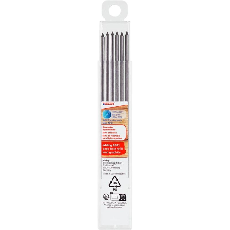 Стержни Edding E-8881 HB 155 мм графит (6 штук в упаковке)<br><br>Набор запасных грифелей edding 8881 для универсального строительного карандаша edding 8880 (арт. 2251173) — поставляется отдельно. В наборе 6 штук в графитовом цвете.Предназначены для глубоких отверстий — для нанесения точной маркировки практически на все материалы, такие как древесина, металл, пластмасса, плитка и картон. Диаметр грифеля — 2,8 мм. позволяет наносить линию толщиной от 1 до 3 мм. С гладких поверхностей надпись можно стереть.Хранить при температуре не более 40С.Особенности:- Для любых материалов: дерево, металл, пластик, картон и др.- Для труднодоступных узких мест.- Цвет — графитовый.- В комплекте 6 шт.- Диаметр грифеля — 2,8 мм.- Толщина линии: 1-3 мм.