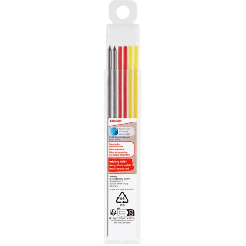Стержни Edding E-8881 HB 155 мм графит и воск (6 штук в упаковке)<br><br>Набор запасных грифелей edding 8881 для универсального строительного карандаша edding 8880 (арт. 2251173) — поставляется отдельно. В наборе 6 грифелей разных цветов: графитовый — 2 шт., красный — 2 шт., жёлтый — 2 шт.Предназначены для глубоких отверстий — для нанесения точной маркировки практически на все материалы, такие как древесина, металл, пластмасса, плитка и картон. Жёлтые и красные грифели (с текстурой на основе воска) идеально подходят для очень гладких и тёмных поверхностей. Диаметр грифеля — 2,8 мм. позволяет наносить линию толщиной от 1 до 3 мм. С гладких поверхностей надпись можно стереть.Хранить при температуре не более 40С.Особенности:- Для любых материалов: дерево, металл, пластик, картон и др.- Для труднодоступных узких мест.- Цвета в наборе: графитовый — 2 шт., красный — 2 шт., жёлтый — 2 шт.- В комплекте 6 шт.- Диаметр грифеля — 2,8 мм.- Толщина линии: 1-3 мм.