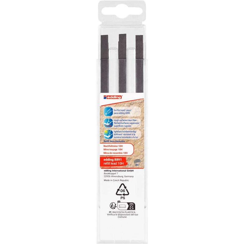 Стержни Edding E-8891 10H 158 мм графит (6 штук в упаковке)<br><br>Набор запасных твёрдых грифелей edding 8891 для универсального строительного карандаша edding 8890 (арт. 2251176) — поставляется отдельно. В наборе 6 штук в графитовом цвете.Предназначены для нанесения маркировки на различные поверхности, такие как древесина, картон, камень или бетон. Прямоугольный грифель (Сечение 2×5 мм) повышенной жёсткости (10H) позволяет наносить линии толщиной от 1 до 5 мм.Особенности:- Для любых материалов: дерево, металл, пластик, картон и др.- Размер сечения грифеля:2×5 мм.- Цвет — графитовый.- В комплекте 6 шт.- Толщина линии: 1-5 мм.- Твёрдость грифеля — 10H.