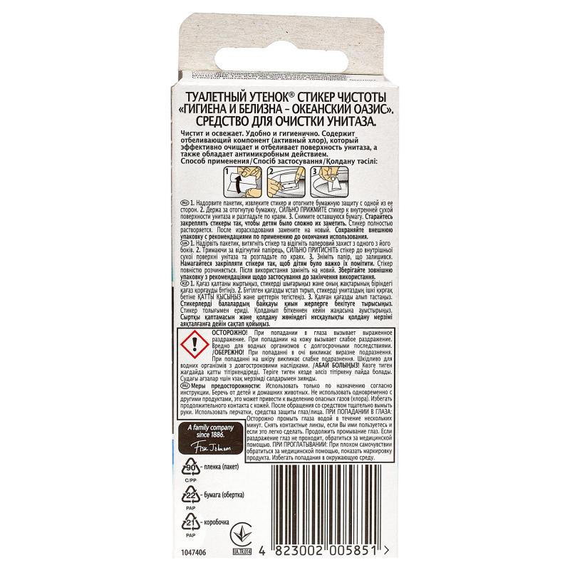 <b>Стикер для унитаза Туалетный утенок Океанский оазис (3 штуки в упаковке) </b> Чистит и освежает. Удобно и гигиенично. Содержит отбеливающий компонент (активный хлор), который эффективно очищает и отбеливает поверхность унитаза, а также обладает антимикробным действием. Благодаря очистителю Туалетный утенок «Стикер чистоты» на поверхности унитаза образуется защитный слой, который препятствует образованию минеральных отложений, являющихся очагами скопления микробов. Очиститель крепится внутри унитаза ниже ободка на сухую поверхность. Обладает приятным ароматом, полностью растворяется в воде. Упаковки стикеров хватает более, чем на 550 смываний. <b>Способ применения. </b> Надорвите пакетик, извлеките стикер и отогните бумажную защиту с одной из ее сторон. Держа за отогнутую бумажку, СИЛЬНО ПРИЖМИТЕ стикер к внутренней сухой поверхности унитаза и разгладьте по краям. Снимите оставшуюся бумагу. Старайтесь закреплять стикеры так, чтобы их сложно было заметить. Стикер полностью растворяется. После израсходования замените на новый. Сохраняйте внешнюю упаковку с рекомендациями по применению до окончания использования. <b>Меры предосторожности.</b> При попадании в глаза вызывает выраженное раздражение. При попадании на кожу вызывает слабое раздражение. Вредно для водных организмов с долгосрочными последствиями. Использовать только по назначению согласно инструкции. Беречь от детей и домашних животных. При необходимости обратиться за медицинской помощью, по возможности показать упаковку/маркировку продукта. После обращения со средством тщательно вымыть руки. Использовать перчатки, средства защиты глаз. ПРИ ПОПАДАНИИ В ГЛАЗА: осторожно промыть глаза водой в течение нескольких минут. Снять контактные линзы, если Вы ими пользуетесь и, если это легко сделать. Продолжить промывание глаз. Если раздражение глаз не проходит, обратиться за медицинской помощью. ПРИ ПРОГЛАТЫВАНИИ: при плохом самочувствии обратиться за медицинской помощью. Избегать попадание в окружающую среду. <b>Состав.</b> а-ПАВ ≥ 30%, сульфат натрия, отдушка (Бутилфенилметилпропиональ, кумарин, цитраль), н-ПАВ <5%, дихлоризоцианурат натрия <5%, акриловый сополимер <5%. <b>Условия хранения. </b> Хранить при температуре от −5 до +30 градусов в сухом, недоступном для детей и домашних животных месте, отдельно от пищевых продуктов, напитков и корма для животных. После использования или по окончании срока годности упаковку/содержимое утилизировать как бытовые отходы.<b>Срок годности. </b> 24 месяца.