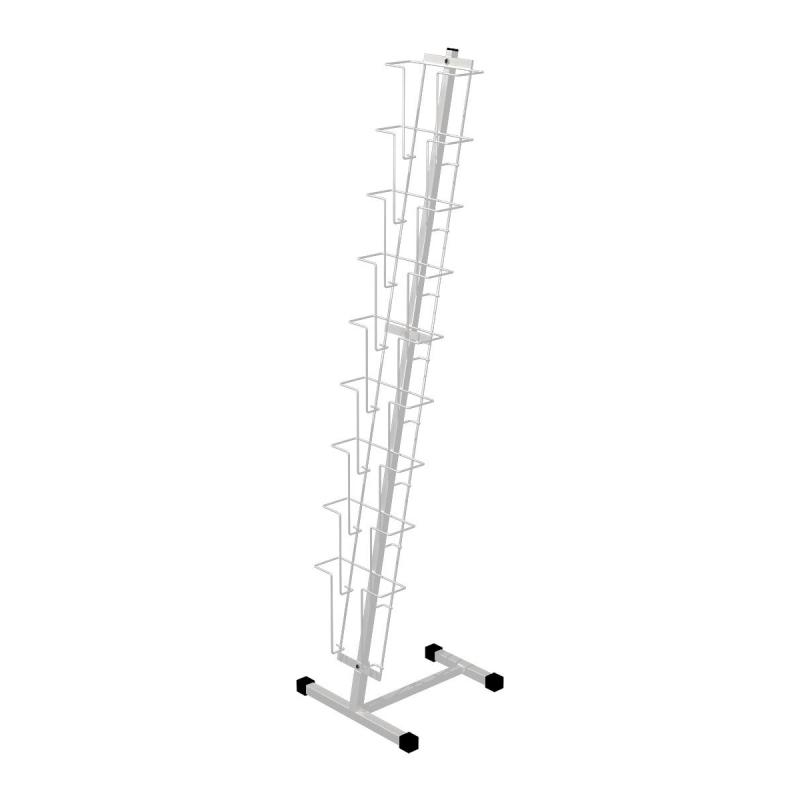 Стойка напольная разборная на 9 лотков (белая, 41,5×39×161 см)<br>Cтойка для печатной продукции <nobr>К010-А4</nobr> белая предназначена для размещения печатной продукции формата А4 и меньше.<br><br>Тип конструкции: разборный. Стойка находится под наклоном в 11° (наиболее эффективный угол для демонстрации печатной продукции), оснащена 9 карманами, похожими по форме на подставки для книг, глубина кармана — 5,5 см. Выпускается в двух цветах на выбор — в белом исполнении и хромированном (основание — окрашено в черный цвет, кармашки — хромированные). Каркас изготовлен из стальной профильной трубы, карманы — из стальной проволоки. Покрыт порошковой краской.<br><br>Компактную стойку можно использовать в качестве рекламного стенда на выставке.