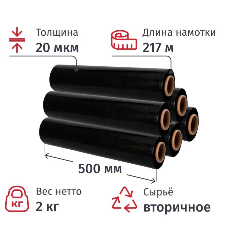 Стрейч-плёнка для ручной упаковки 2 кг 20 мкм x 500 мм x 217 м чёрная вторичное сырьё (6 штук в упаковке)<br><br>Цветная стрейч-плёнка для ручной упаковки представляет собой универсальный упаковочный материал, обладающий функцией маркировки. Используется для маркировки товара, упаковки грузов и обмотки коробок. <br><br>Рулоны плёнки хранят в вертикальном положении в крытых складских помещениях, при температуре от +5 до +30°С.<br>Перед использованием стрейч-плёнку необходимо выдержать при температуре выше +18°С не менее 24 часов.<br><br>Для вторичного сырья длина указана исходя из расчётных параметров веса нетто сырья и может варьироваться в зависимости от партии. Вторичная стрейч-плёнка может обладать запахом полимеров, а так же содержать небольшие вкрапления.<br><br>Возможны незначительные отклонения оттенка стрейч-плёнки из-за клеевого компонента в зависимости от партии и производителя.