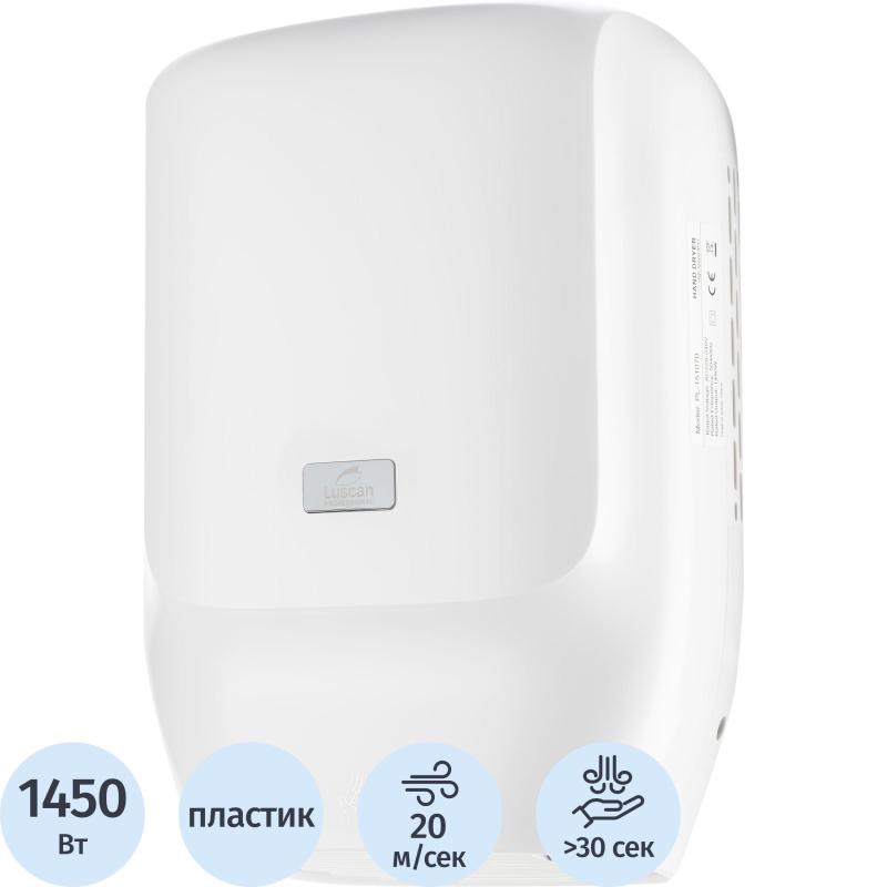 Стильная и функциональная сушилка для рук Luscan Professional PL-151070 с мощным щёточным двигателем обеспечивает быструю сушку благодаря высокоскоростному потоку воздуха с автоматической регулировкой температуры. <br>Гигиеничное сенсорное управление, прочный ABS-пластик и лаконичный дизайн делают её идеальным выбором для кафе, офисов, торговых и деловых центров.<br>Характеристики:<br>- Тип сушилки: настенная.<br>- Тип управления: сенсорное.<br>- Размеры (ДxВxГ): 232×327×131 мм.<br>- Материал корпуса: ABS-пластик.<br>- Электрическая изоляция: Класс II.<br>- Фильтр: НЕРА.<br>- Тип двигателя: щёточный двигатель.<br>- Мощность двигателя: 1450 Вт.<br>- Напряжение/частота: 100–130 В переменного тока/220—240 В, 50/60 Гц.<br>- Номинальная мощность: 650 Вт.<br>- Уровень шума: 75 дБ.<br>- Скорость воздуха: 20 м/с.<br>- Температура воздуха: 20-45 °C.<br>- Время высыхания: 8-15 с.<br>- Расстояние срабатывания: 10-12 см.<br>- Защита по времени: 45 с.<br>- Степень защиты: 1PX1.<br>- Вес: 3 кг.<br>Хранение: хранить в сухом, прохладном месте, вдали от источников тепла и открытого огня. Не допускать попадания прямых солнечных лучей и сильных температурных колебаний в зоне хранения. <br>Транспортировка и распаковка: распаковывать изделие следует в сухом помещении при температуре не ниже +15°С. При транспортировке при температуре окружающей среды от 0°С до +10°С распаковывать и устанавливать изделие следует не менее чем через 24 часа, а при температуре ниже 0°С — не менее чем через 48 часов после переноса его в помещение с температурой не ниже +15°С.<br>Перед использованием прибора внимательно ознакомьтесь с руководством пользователя.<br>Безопасно при использовании по назначению.<br>Гарантийный срок: 12 месяцев.