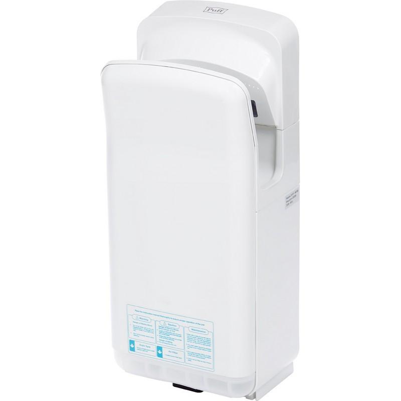 <b>Сушилка для рук электрическая Puff 8878B белая.</b><br>Высокоскоростная электросушилка для рук — это современный и высокотехнологичный прибор для сушки рук. Основной особенностью этого устройства является быстрый и гигиеничный цикл сушки рук после мытья — около 5-7 секунд. Такой эффект достигается за счет высокой скорости воздушного потока, который возможен из-за использования электродвигателя без щеток и трущихся частей. Электромотор имеет защиту от перегрева и отключится, если его температура превысит 80°С. Используется фильтрация воздуха в сушилке, что делает его чистым. Бесконтактный принцип сушки рук с помощью электросушилки предотвращает заражение рук бактериями, которое может возникнуть при контакте с бумажными полотенцами. Гигиеничность процесса сушки рук обеспечивает воздушный фильтр, через который проходит воздух. Конструкция двигателя позволяет не нагревать воздух, что делает процесс сушки рук более комфортным, а также более гигиеничным, поскольку такой нагрев не высушивает кожу рук, сохраняя ее естественную влажность. Использование специальной конструкции воздухозаборника уменьшает уровень шума и позволяет использовать устройство в местах с требованиями к тишине — в больницах и офисах. Корпус высокоскоростной сушилки для рук выполнен из прочного, вандалоустойчивого и огнеупорного ABS-пластика толщиной 3 мм. Корпус белого цвета. Влага с рук в процессе сушки стекает вниз в специальный водосборник объемом 500 мл, исключая ситуацию, когда вода попадает на пол. Скоростная сушилка монтируется при помощи специального установочного комплекта, входящего в комплект поставки. Эргономичная высота расположения устройства позволяет сушить руки, не поднимая их, тем самым исключая возможность стекания воды за рукава. <b><br>Особенности:</b> выбор режима: холодный/горячий. Класс влагозащищенности IPX4. УФ-подсветка. Автоотключение прибора через 25 секунд. Низкий уровень шума. <b><br>Способ крепления:</b> на стену, вертикально. <b><br>Комплектация:</b> <br>Сушилка для рук — 1 штука. <br>Набор креплений — 1 штука.<br>Инструкция — 1 штука. <br>Гарантия 2 года.