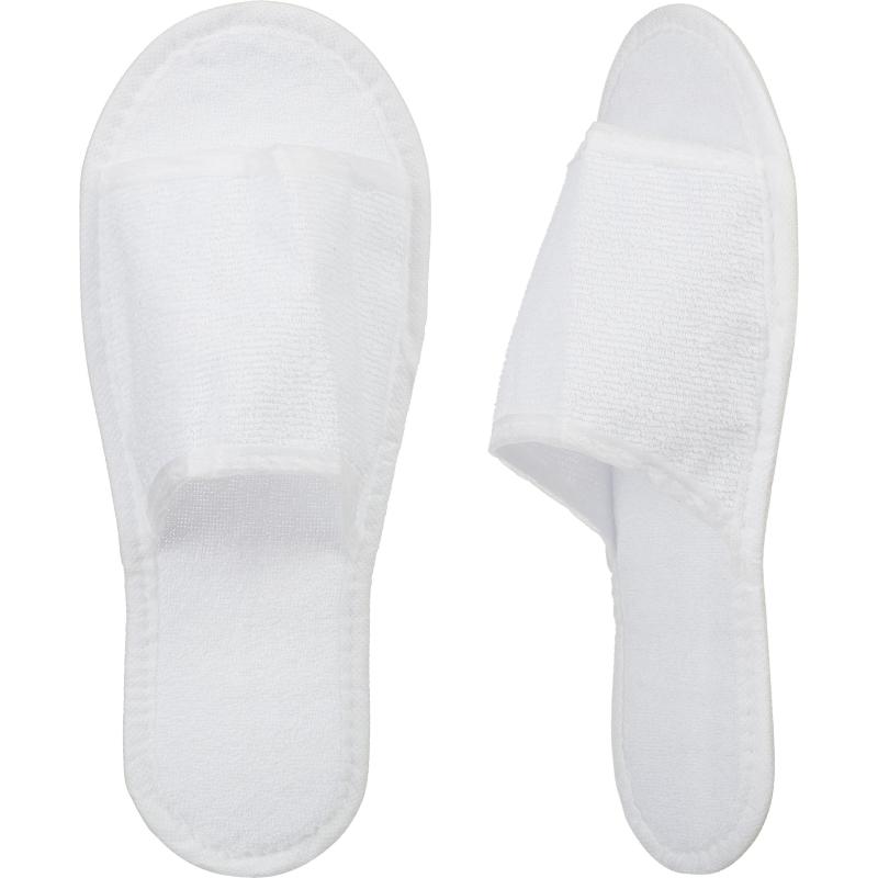 Тапочки одноразовые махровые хлопок открытый мыс подошва 4 мм белые (100 пар в упаковке)<br><br>Махровые тапочки начального уровня, предназначенные для использования на сухих поверхностях.<br>Одноразовые тапочки белого цвета с открытым мысом для гостиничных номеров, а также различных медицинских и косметологических учреждений. Предназначены для использования на сухих поверхностях.<br>Верх из махровой ткани плотностью 200 г/кв.м.<br>Подошва: изолон 4 мм.<br>Имеют универсальный размер: 38–42.<br>Продаются упаковками по 100 пар.<br><br>Каждая пара упакована в индивидуальный полиэтиленовый пакет. На пакете могут быть нанесены текстовые и прочие символы, предусмотренные поставщиком.