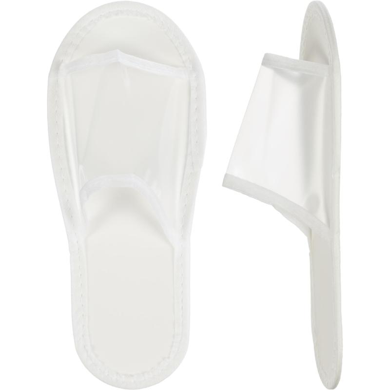 Тапочки одноразовые Водолей ПВХ открытый мыс подошва 2.5 мм прозрачные (150 пар в упаковке). Одноразовые тапочки белого цвета для гостиничных номеров, а также различных медицинских и косметологических учреждений. <br>Верх из ПВХ. <br>Подошва (слои снизу вверх): — ЭВА толщиной 2.5 мм. <br>Имеют универсальный размер: 38-42. <br>Продаются упаковками по 150 пар.<br>Каждая пара упакована в индивидуальный полиэтиленовый пакет. На пакете могут быть нанесены текстовые и прочие символы, предусмотренные поставщиком. В зависимости от напольного покрытия тапочки с подошвой ЭВА могут быть устойчивы на влажных полах.
