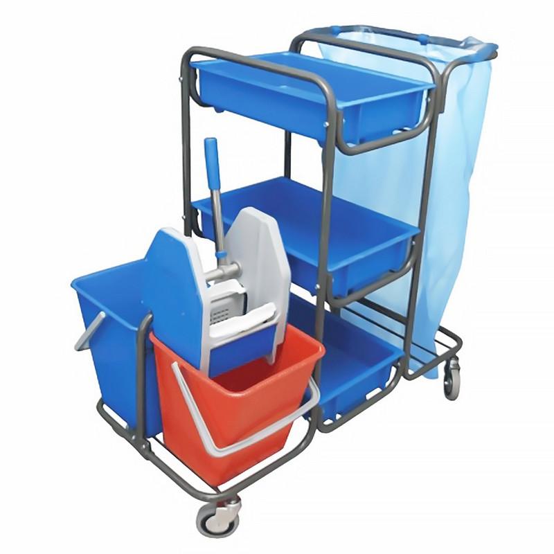 <p>Тележка уборочная, универсальная. Предназначена для комплексной уборки помещений. Прочная и надежная конструкция, оборудована потивоударными бамперами. Комплектуется колесами 100 мм. Мешок для мусора из полиэтилена 120 л.</p> <b>Тележка поставляется в разобранном виде.</b>