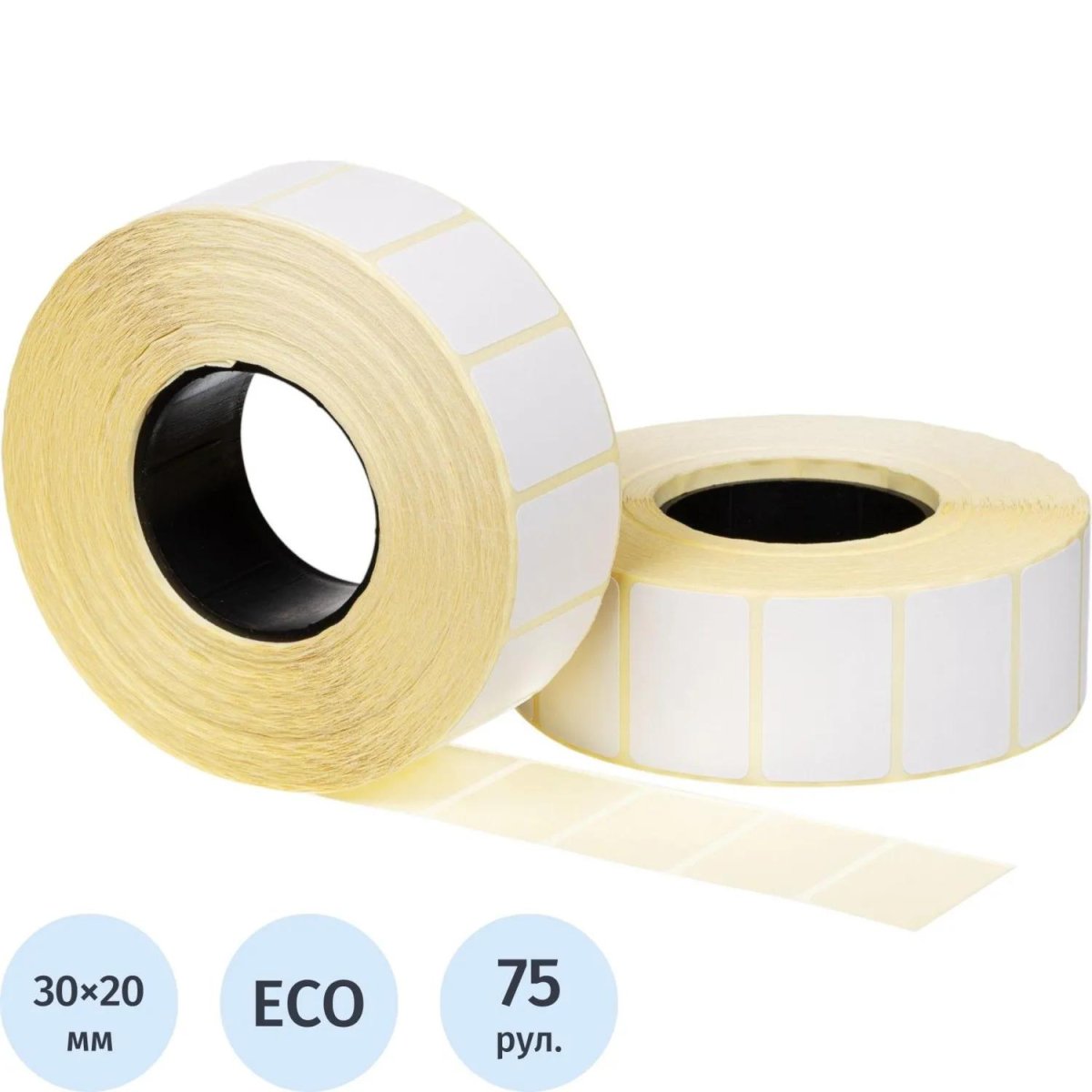 Термоэтикетки 30×20 мм ЭКО 40 мм диаметр втулки (75 рулонов по 2000 этикеток)<br><br>Термоэтикетки без печати белого цвета изготовлены из материала Thermal ECO (ЭКО). Рулон с втулкой диаметром 40 мм содержит 2000 плюс-минус 5 этикеток. Самоклеящиеся термоэтикетки применяются для нанесения веса, штрихкодов, цен и другой информации, маркировки товаров недлительного хранения. Потенциальные потребители — супермаркеты, производство, центры техобслуживания кассовых аппаратов, снабжающие компании, компании по поставке упаковочных материалов, предприятия, занимающиеся фасовкой продукции и т. д. Не рекомендуется использовать для маркировки «сложных» поверхностей (камень, металл и др.)<br><br>Термоэтикетки предназначены для печати на термопринтерах в режиме прямой термопечати (Direct Termal, печать с помощью термоголовки).