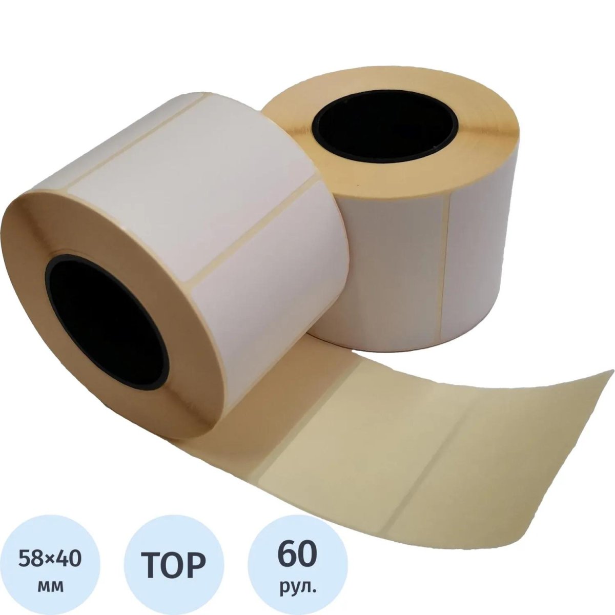 Термоэтикетки 58×40 мм ТОП 40 мм диаметр втулки (60 рулонов по 700 этикеток)<br><br>Термоэтикетки размером 58×40 мм без печати белого цвета изготовлены из материала Thermal Top (Top) ведущих производителей. Рулон с втулкой диаметром 40 мм содержит 700 плюс-минус 5 этикеток. Рулоны упакованы в гофрокороба по 60 штук. Самоклеящиеся термоэтикетки применяются для нанесения веса, штрихкодов, цен и другой информации, маркировки товаров недлительного хранения. Потенциальные потребители — супермаркеты, производство, центры техобслуживания кассовых аппаратов, снабжающие компании, компании по поставке упаковочных материалов, предприятия, занимающиеся фасовкой продукции и т. д.<br><br>Обращаем ваше внимание, что у производителя происходит смена исходного сырья. В переходный этап возможны незначительные различия во внешнем виде и в плотности подложки, которые не влияют на качественные и технические характеристики этикеток.<br><br>Термоэтикетки предназначены для печати на термопринтерах в режиме прямой термопечати (Direct Termal, печать с помощью термоголовки).
