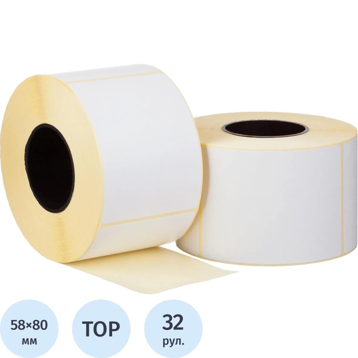 Термоэтикетки 58×80 мм ТОП 40 мм диаметр втулки влагостойкие и морозостойкие (32 рулона по 500 этикеток)<br><br>Термоэтикетки размером 58×80 мм без печати изготовлены из высококачественного материала Thermal TOP (ТермоТоп). Рулон со втулкой диаметром 40 мм содержит 500 плюс-минус 5 этикеток. Самоклеящиеся термоэтикетки применяются для нанесения веса, штрихкодов, цен и другой информации, маркировки товаров недлительного хранения. Этикетки ТОП подходят для заморозки. Потенциальные потребители — супермаркеты, производство, логистика, центры техобслуживания кассовых аппаратов, снабжающие компании, компании по поставке упаковочных материалов, предприятия, занимающиеся фасовкой продукции и т. д.<br><br>Термоэтикетки предназначены для печати на термопринтерах в режиме прямой термопечати (Direct Termal, печать с помощью термоголовки).