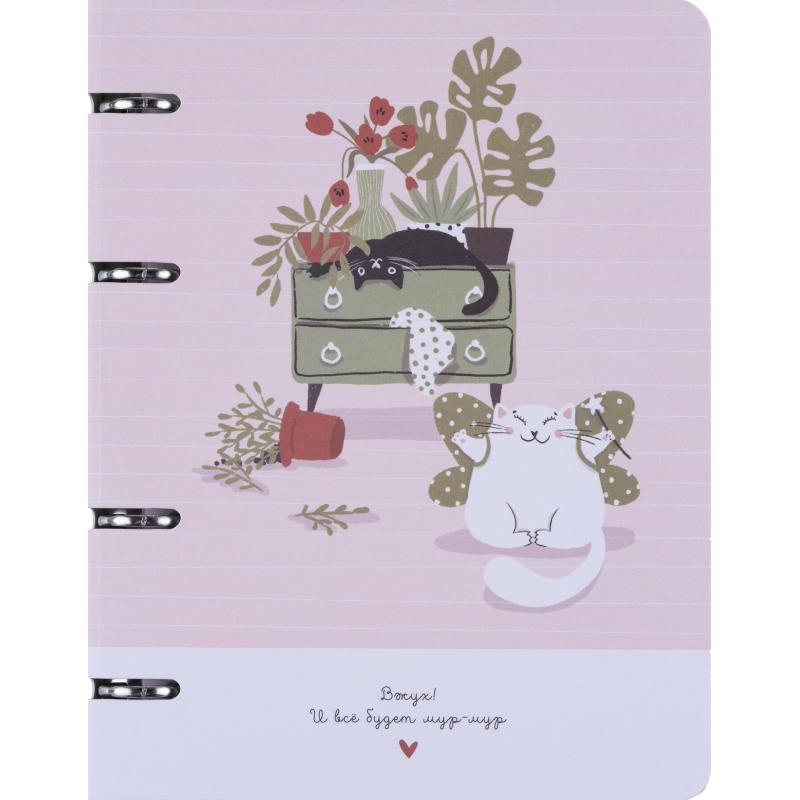 Тетрадь на кольцах со сменным блоком Be Smart Mur-Mur А5 120 листов с рисунком в клетку с перфорацией, матовая ламинация<br><br>Тетрадь формата A5 (163×212 мм) с кольцевым механизмом — это весёлый и стильный аксессуар для записи лекций, заметок и задач. Она удобно помещается в рюкзаке или сумке и станет незаменимым помощником в учёбе. Кольцевой механизм позволяет легко добавлять и удалять листы, а также вставлять дополнительные блоки или разделители для организации записей по разным предметам.<br><br>Обложка выполнена из мелованного картона плотностью 500 г/кв.м с цветным принтом, украшена матовой ламинацией, что придаёт тетради прочность и долговечность. Скруглённые уголки обложки защищают её от повреждений и помогают сохранить внешний вид при хранении в сумке. Внутренний блок состоит из 120 листов (240 страниц) белой офсетной бумаги плотностью 65 г/кв.м с клеточной линовкой и серыми линиями. Листы имеют прямые уголки и белизну 100%, а блок включает титульный лист. Размер листа — 14×20 см.
