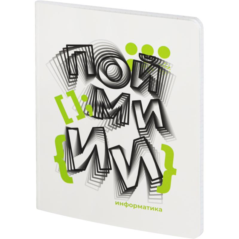 Тетрадь предметная по информатике Комус Класс Кириллица А5 48 листов в клетку, Soft Touch<br><br>Тетрадь предназначена для занятий по информатике. Формат А5 (размер листа 16,4×21 см) делает её удобной для хранения и использования как в школе, так и дома. Внутренний блок состоит из 48 листов белой офсетной бумаги с синей клеткой и полями. Бумага имеет плотность 60 г/кв. м и белизну 100%, что обеспечивает комфорт при письме. Обложка изготовлена из картона плотностью 190 г/кв. м, обладает мягкой структурой и покрыта Soft Touch-покрытием для приятных тактильных ощущений и дополнительной стойкости к износу. Крепление выполнено на скрепках, расположено слева. Перфорация и поле для подписи отсутствуют. Разделителей также нет.