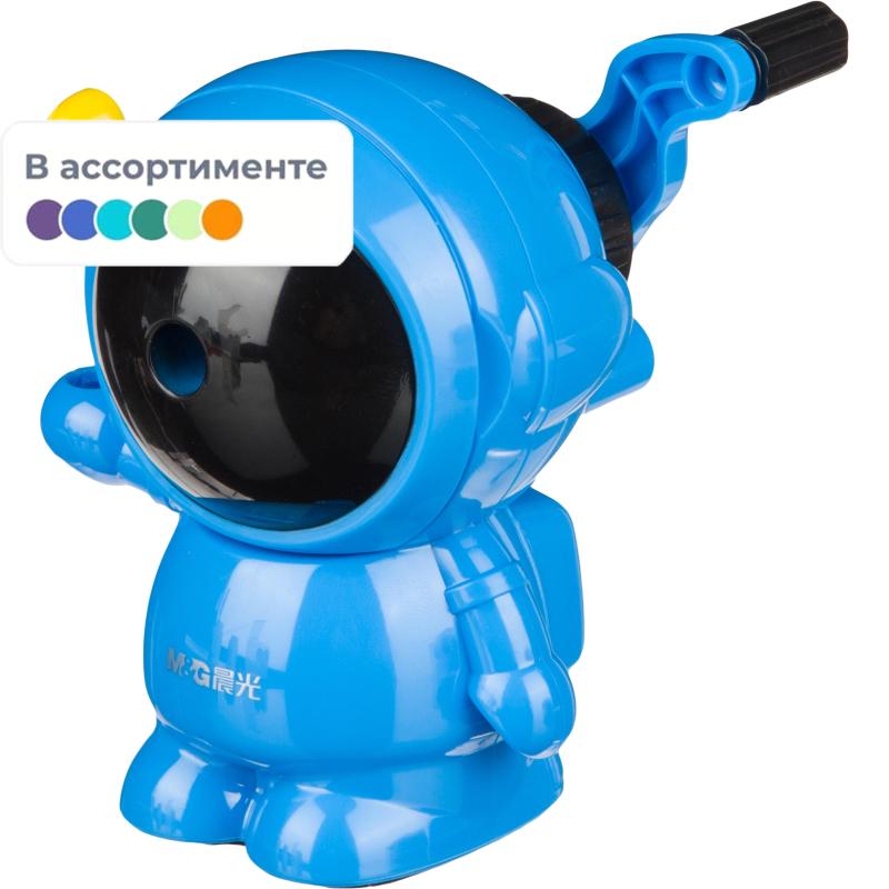 Механическая точилка для карандашей M&G выполнена в пластиковом корпусе в форме космонавта. Легкая и безопасная в использовании точилка оснащена металлическим сердечником и удобной ручкой, что позволит максимально быстро заточить большое количество карандашей. Предназначена для круглых, трехгранных или шестигранных карандашей диаметром до 8 мм. Ограничений по длине карандаша нет. Точилка имеет вместительный контейнер для сбора стружки и держатель для карандаша. Размер точилки: 100×85 мм.<br><br>Инструкция по использованию:<br>1. Оттяните до упора прижимной механизм, располагающийся над контейнером для стружки.<br>2. Нажмите на маленькие рычаги в верхней части точилки для раскрытия креплений (зубов) в отверстии.<br>3. Поместите карандаш в отверстие до упора.<br>4. Отпустите рычаги для фиксации карандаша.<br>5. Придерживая точилку сверху, проворачивайте ручку до тех пор, пока она не будет проворачиваться вхолостую.<br>6. Нажмите на язычки и, удерживая, выньте карандаш из точилки.<br>7. По заполнении контейнера для стружки требуется его очистка во избежание поломок и блокировки точилки.<br><br>Рекомендована для использования дома и в офисе.<br><br>Внимание! Товар поставляется в различных вариантах дизайна/цвета без возможности выбора.<br>