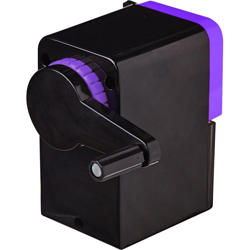 Точилка механическая с одним отверстием Attache Selection. Точилка выполнена в черном пластиковом корпусе с деталями фиолетового цвета. Стальной сердечник. Выдвижной механизм для захвата карандаша, регулирующий заточку. Для карандашей диаметром не более 8 мм. Предназначена для круглых, трехгранных или шестигранных карандашей. При необходимости точилка может быть зафиксирована при помощи прилагаемой струбцины (в комплекте). Минимальная длина затачиваемого карандаша — 60 мм. Размер точилки: 105×58×91 мм. Основание точилки имеет противоскользящее покрытие. Данная точилка обладает механизмом смены лезвия.<BR>Инструкция по использованию:<BR>1. Нажмите на маленькие рычаги в верхней части точилки для раскрытия креплений(зубов) в отверстии.<BR>2. Поместите до упора карандаш в отверстие.<BR>3. Не отпуская рычагов, оттяните прижимной механизм вдоль карандаша до упора.<BR>4. Отпустите рычаги для фиксации карандаша.<BR>5. Придерживая точилку сверху, проворачивайте ручку до тех пор, пока ручка не будет проворачиваться вхолостую.<BR>6. Нажмите на язычки и, удерживая, выньте карандаш из точилки.<BR>7. По заполнении контейнера для стружки требуется его очистка во избежание поломок и блокировки точилки.<BR>Рекомендованы для использования дома и в офисе.