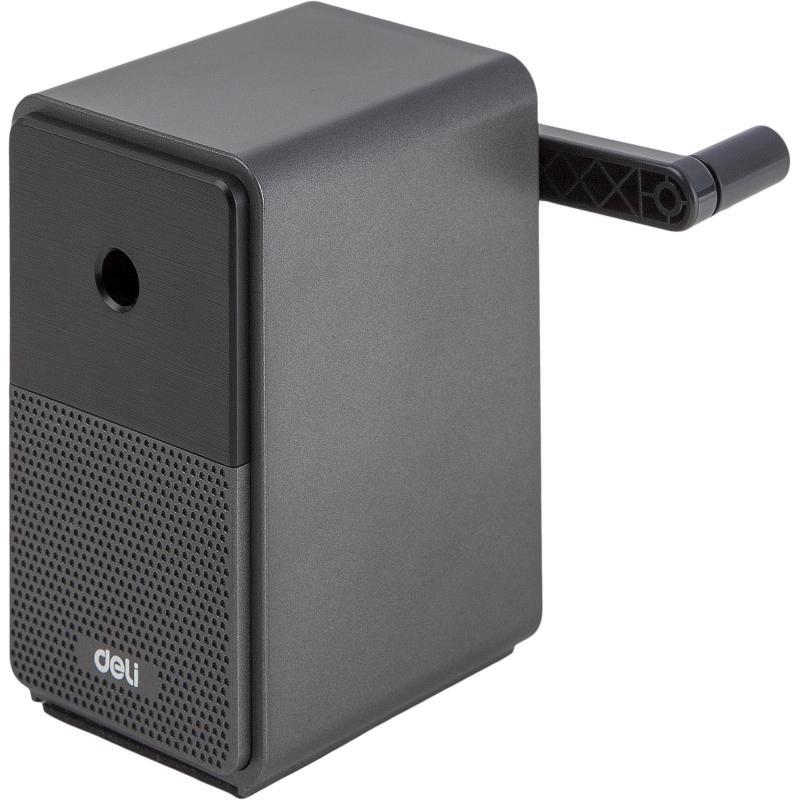 <p>Точилка Deli механическая черная для карандашей в стиле ретро. Корпус изготовлен из <nobr>ABS-пластика</nobr>. Точилка с одним отверстием благодаря регулировке диаметра подойдет для заточки карандашей 6.9, 8 мм, а так же любой формы: трех и шестигранной. Точилка оснащена индикатором регулировки заточки толщины и остроты грифеля. Оборудована противоскользящим покрытием, благодаря чему затачивать карандаши можно одной рукой. Высококачественное стальное лезвие и точно рассчитанная конструкция, позволяют сделать процесс затачивания не только легким, но и сводят риск поломки грифеля к нулю. Настольная механическая точилка для карандашей имеется вместительный резервуар для стружки. Размеры: 106×63×111 мм.</p>