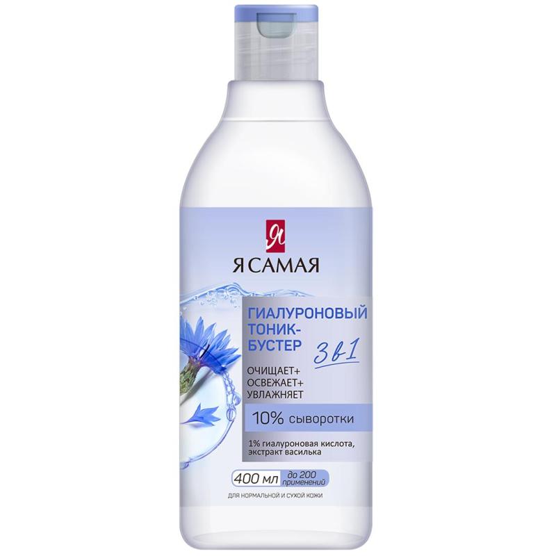 Тоник-бустер для лица Я Самая 3 в 1 для нормальной и сухой кожи 400 мл<br><br>Гиалуроновый тоник-бустер для нормальной и сухой кожи. Эксперты бренда «Я Самая» создали ухаживающую формулу тоника, содержащую 10% сыворотки для бережного ухода за кожей лица, а также для дополнительного увлажнения в течение всего дня. Гиалуроновая кислота обеспечивает интенсивное и длительное увлажнение, повышает упругость и эластичность кожи. Экстракт василька увлажняет, выравнивает цвет лица, тонизирует и успокаивает кожу.<br><br>Способ применения: смочите ватный диск тоником. Лёгкими движениями нанесите тоник на кожу лица и область декольте.<br><br>Состав: Aqua, Glycerin, Hydroxyethyl Urea, Argania Spinosa Kernel Oil, Poloxamer 184, Centaurea Cyanus (Cornflower) Flower Extract, Allantoin, PEG-40 Hydrogenated Castor Oil, Sodium Hyaluronate, Panthenol, Cocos Nucifera (Coconut) Extract, Benzyl Alcohol, Sodium Benzoate, Potassium Sorbate, Citric Acid, Disodium EDTA, Parfum.
