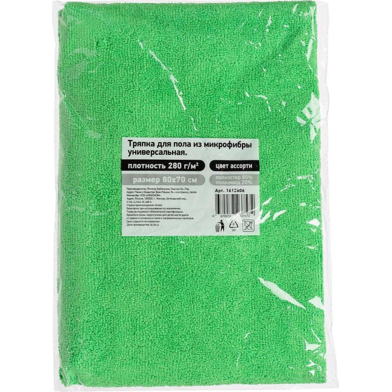 Тряпка для пола 70×80 см микрофибра 280 г/кв.м в ассортименте<br><br>Назначение: для мытья полов. Тряпка из плотной микрофибры идеально подходит для мытья всех видов покрытий. Она не царапает поверхности и отлично впитывает воду как губка. <br>Особенности и преимущества: <br>− предназначена для мытья пола из любых материалов. <br>− хорошо впитывает влагу. <br>− полирует поверхность. <br>− удаляет загрязнения и пыль. <br>− лёгкая и удобная в применении. <br>− долгий срок службы. <br>Характеристики: <br>− размер: 70×80 см. <br>− цвет: в ассортименте. <br>− состав: 100% полиэстер. <br>− плотность ткани 280 г/кв.м. <br>Рекомендации по уходу: нет. <br><br>Внимание! Товар поставляется в различных вариантах цвета (без возможности выбора).