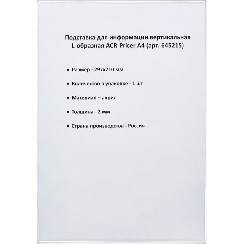 <p>Держатель информации из пластика<nobr>L-образный</nobr> формата А4. Применяется в качестве держателя ценников и информационного носителя. Ширина ножки — 11,5 см.</p>