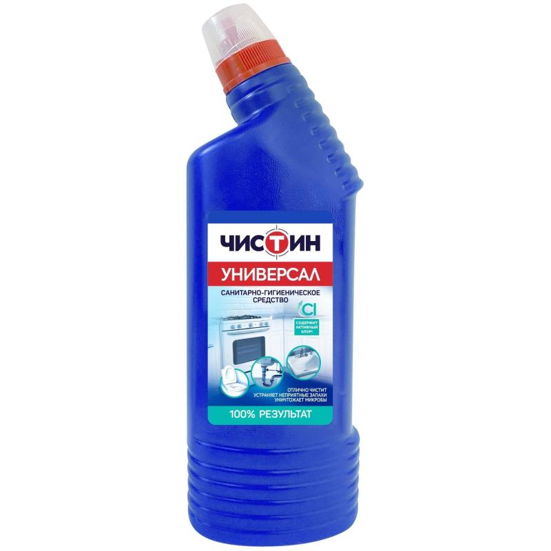 Универсальное чистящее средство Чистин Хлорный гель 0,75 кг<br><br><b>Назначение:</b> санитарно-гигиеническое средство уничтожает микробы, грибок и неприятные запахи. Предназначено для чистки и антимикробной обработки раковин, ванн, душевых кабин, унитазов, а также для профилактики засоров канализационных стоков, мытья керамической плитки и любых твёрдых моющихся напольных покрытий.<br><b>Способ применения:</b><br>— Раковины, ванны, унитазы, керамическая плитка: нанести средство на поверхность, при необходимости выдержать 2–5 минут, затем почистить и тщательно смыть водой.<br>— Для уничтожения микробов и удаления стойких загрязнений: выдержать 60 минут, затем смыть водой.<br>— Канализационные стоки: налить 250 мл средства в слив и оставить на ночь.<br><b>Меры предосторожности:</b> осторожно! Содержит щёлочь! При попадании на кожу и в глаза вызывает раздражение. Использовать резиновые перчатки или щётку при работе. При попадании на кожу или в глаза — немедленно промыть большим количеством проточной воды. При необходимости обратиться к врачу.<br><b>Состав:</b> <5% гипохлорит натрия, <5% АПАВ или мыло на основе натуральных жирных кислот, НПАВ, <5% щёлочь, соль ЭДТА, ароматизирующая добавка.<br><b>Условия хранения:</b> хранить в плотно закрытой упаковке, в недоступном для детей месте, отдельно от пищевых продуктов.<br><b>Срок годности:</b> 18 месяцев с даты изготовления (дату изготовления см. на упаковке).<br>