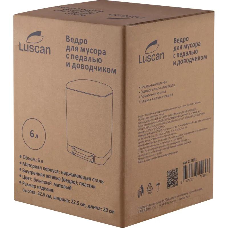Ведро мусорное Luscan 6 л нержавеющая сталь с педалью с крышкой бежевое (32.5×22.5×23 см)<br><br>Ведро Luscan с педалью и доводчиком предназначено для сбора бытового мусора. Корпус выполнен из нержавеющей стали. Механизм доводчика обеспечивает тихое и плавное закрывание крышки. Наличие педального механизма позволяет не соприкасаться с конструкцией ведра руками.<br>Объём 6 л.<br>Размер ёмкости (ВxШxГ): 32.5×22.5×23 см.<br>Цвет: бежевый.<br>Вес: 1.25 кг.