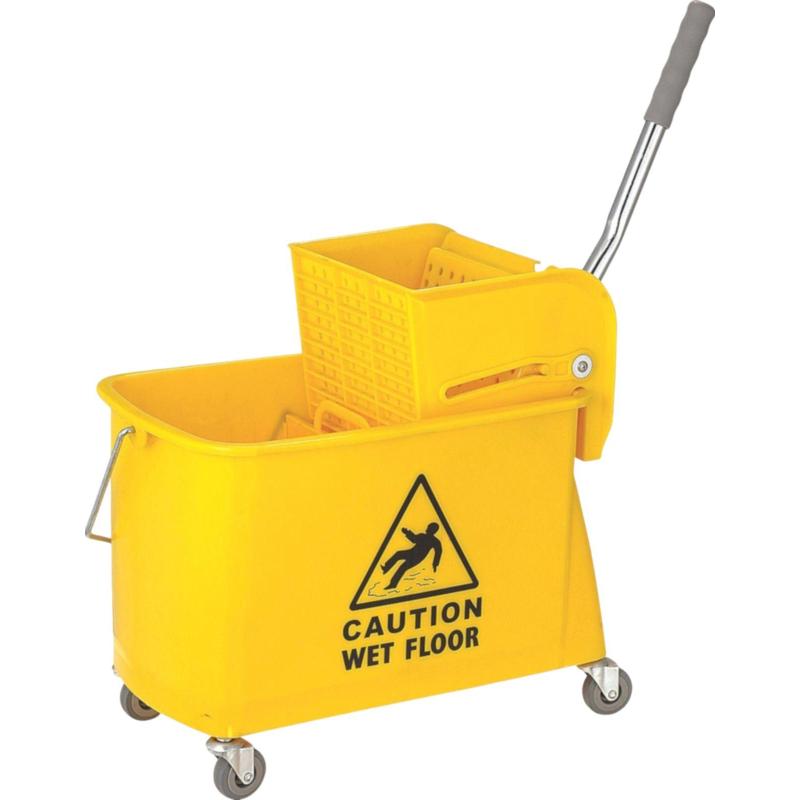 Ведро на колесах с механическим отжимом для швабр двух типов: плоского флаундерa и ?Кентукки?. Изделие изготовлено из ударопрочного пластика, его габариты составляют 47x27 см. Ведро имеет две секции (перегородка съемная), перекидную металлическую ручку и поворотные колеса из стали, оснащенные пластиковыми протекторами. Емкость ведра - 20 литров. По обеим сторонам инвентаря имеется знак ?Осторожно, скользко?. Относится к сегменту ?суперэконом? - товар с минимальными требованиями к качеству для тех, кто хочет сэкономить. Товар отвечает основным потребительским характеристикам.