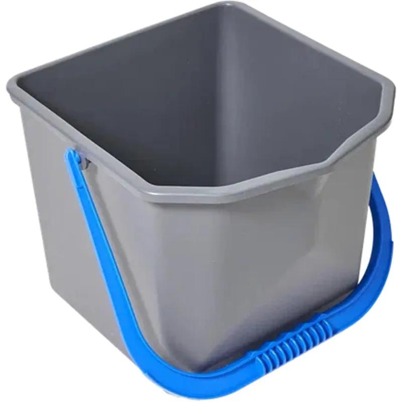 Ведро Росмоп 25 л пластик серое/синяя ручка (с мерной шкалой, ударопрочное)<br><br>Ведро объёмом 25 л выполнено из ударопрочного пластика в сером цвете с синей ручкой для цветовой кодировки. На внутренней поверхности нанесена мерная шкала с делением по 1 л, что позволяет точно рассчитывать концентрацию моющих растворов.<br>Прямоугольная форма делает модель удобной в использовании и хранении. На дне предусмотрена специальная выемка для удобного слива жидкости. Внешние отверстия позволяют фиксировать ведро на колёсной базе Росмоп, которая оснащена четырьмя колёсами диаметром 50 или 75 мм и упрощает транспортировку по полу. Колёсная база приобретается отдельно.<br>Размеры изделия: верхняя часть 36.4×38 см, нижняя 34×32 см, высота 31.1 см. Весит ведро 1.005 кг.