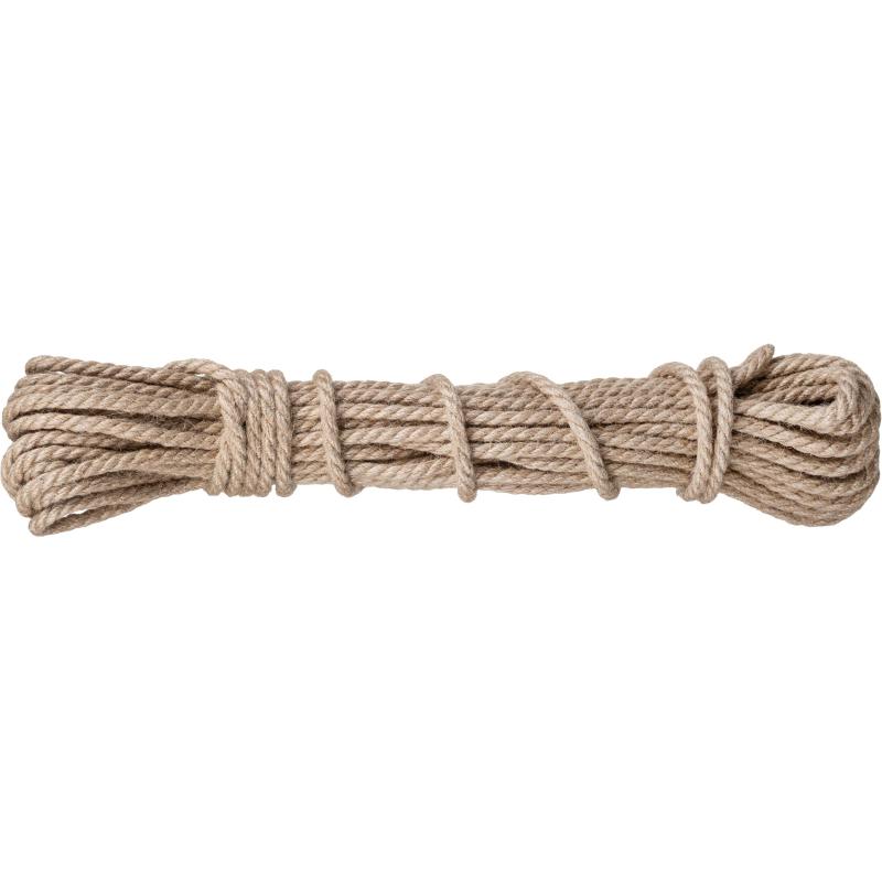 Верёвка джутовая кручёная (6 мм, 20 м). Верёвка джутовая используется в строительстве, а также для поднятия и опускания грузов при строительных работах.<br>Применяется в качестве отделочного материала при постройке бревенчатых сооружений.<br>Верёвка может использоваться и для хозяйственных нужд, а также для упаковки продукции, плетения макраме, для производства ковровых покрытий, мебели и элементов декора.