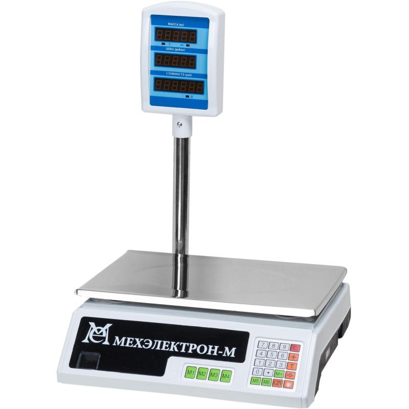 Весы торговые настольные Мехэлектрон-М (ВР4900-15-2 Д-СДБ 05)<br><br>Весы настольные электронные торговые предназначены для использования на предприятиях торговли и общественного питания и промышленности. Весы могут применяться и в других отраслях народного хозяйства.<br><br>Весы сертифицированы по ГОСТ OIML R <nobr class="phone">76-1-2011</nobr> и внесены в Государственный реестр средств измерений. Имеют поверку ЦСМ на год.<br><br>Питание: от сети 220 В; от аккумулятора, не менее 8 часов непрерывной работы.<br>Температура эксплуатации: −10/+40°C.<br>Влагозащитный чехол: есть.<br>Платформа: нержавеющая сталь.<br>Особенности: функция расчёта сдачи покупателю.<br>Опциональные режимы: счётный, процентный, компараторный.