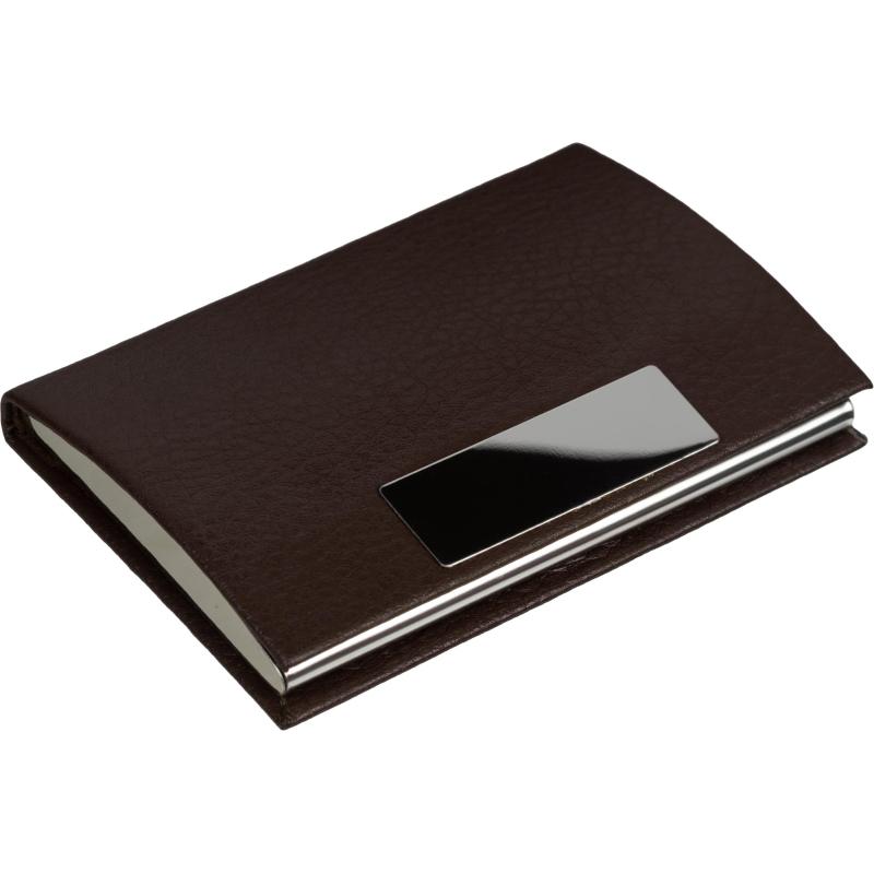Визитница карманная экокожа на 20 визиток.<br> Визитница карманная на 20 визиток металлическая обтянута коричневой экокожей. Имеет хромированный шильд для гравировки. Используется для хранения визитных, банковских, дисконтных карточек.