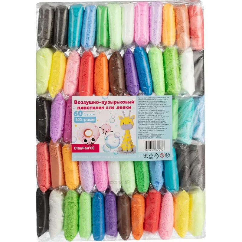 Воздушный пластилин ClayFan 60 цветов 600 г<br><br>Воздушный пластилин подходит для лепки и развития творческих навыков у детей от 3 лет. В набор входит 60 разноцветных брусочков общей массой 600 г. Материал не липнет к рукам, легко мнётся и хорошо держит форму после застывания на воздухе. В комплекте предусмотрена пластиковая стека, позволяющая прорабатывать мелкие детали. Пластилин упакован в полиэтиленовый пакет.