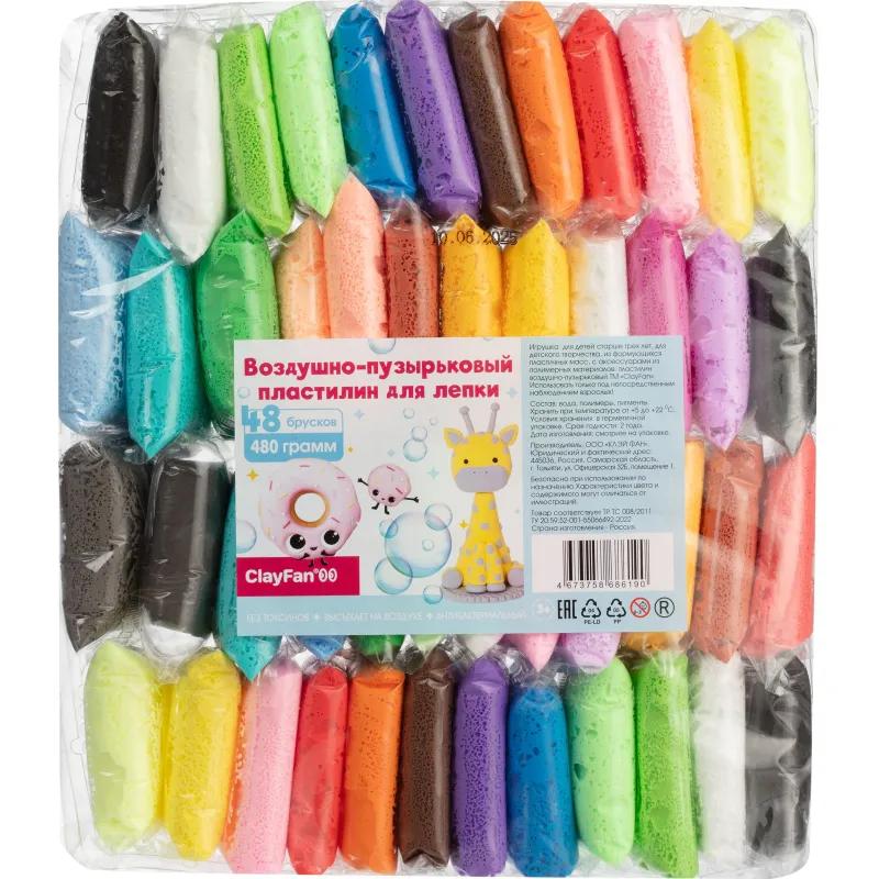 Воздушный пластилин ClayFan 48 цветов 480 г<br><br>Воздушный пластилин предназначен для детского творчества и лепки с детьми от 3 лет. Набор включает 48 насыщенных цветов, масса материала составляет 480 г. Пластилин мягкий, лёгкий и не прилипает к рукам, легко лепится и застывает на воздухе, позволяя сохранить созданные фигуры. В комплект входит пластиковая стека для удобной проработки деталей. Упакован в полиэтиленовый пакет.