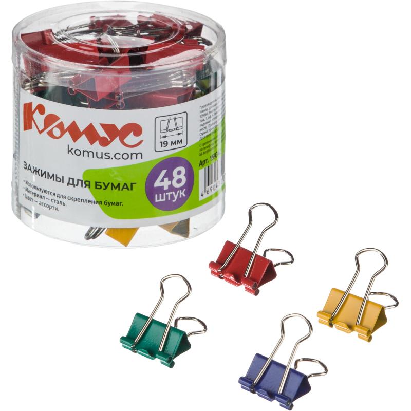 Металлические зажимы для бумаг Комус используются для скрепления документов без использования степлеров. Зажимы с цветным покрытием. Цвета зажимов в упаковке: желтый, синий, красный, зеленый. Размер зажима: ширина 19 мм, высота 38 мм, глубина закладки 11 мм. Позволяет скреплять до 80 листов плотностью 80 г/кв.м, не деформируя при этом бумагу. Зажимы для бумаг поставляются по 48 штук в удобной для хранения пластиковой упаковке. В транспортном коробе 96 упаковок.<BR>Зажимы Комус — это надежное скрепление документов.<br>Для эффективного скрепления максимально допустимого объема листов бумаги необходимо, чтобы листы были собраны в ровную стопку без заломов, загибов и дефектов поверхности бумаги.