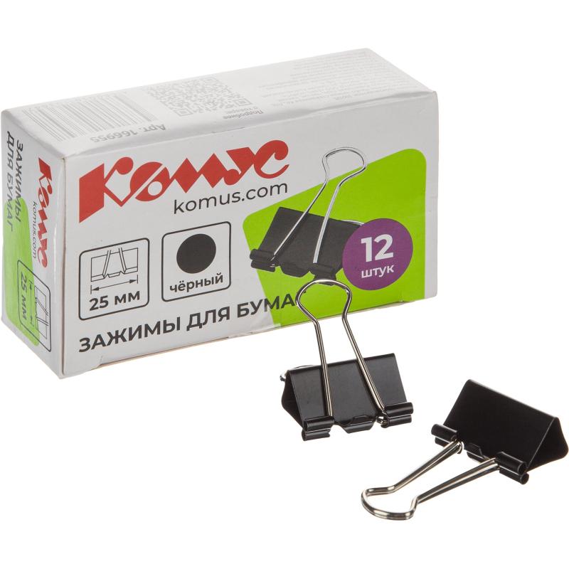 Металлические зажимы для бумаг Комус используются для скрепления документов без использования степлеров. Зажимы из металла с черным покрытием. Размер зажима: ширина 25 мм, высота 48 мм, глубина закладки 16 мм. Позволяет скреплять до 100 листов плотностью 80 г/кв.м, не деформируя при этом бумагу. Зажимы для бумаг поставляются по 12 штук в картонной упаковке.<BR>В транспортном коробе 24 упаковки. <BR>Зажимы Комус — это надежное скрепление документов.<br>Для эффективного скрепления максимально допустимого объема листов бумаги необходимо, чтобы листы были собраны в ровную стопку без заломов, загибов и дефектов поверхности бумаги.