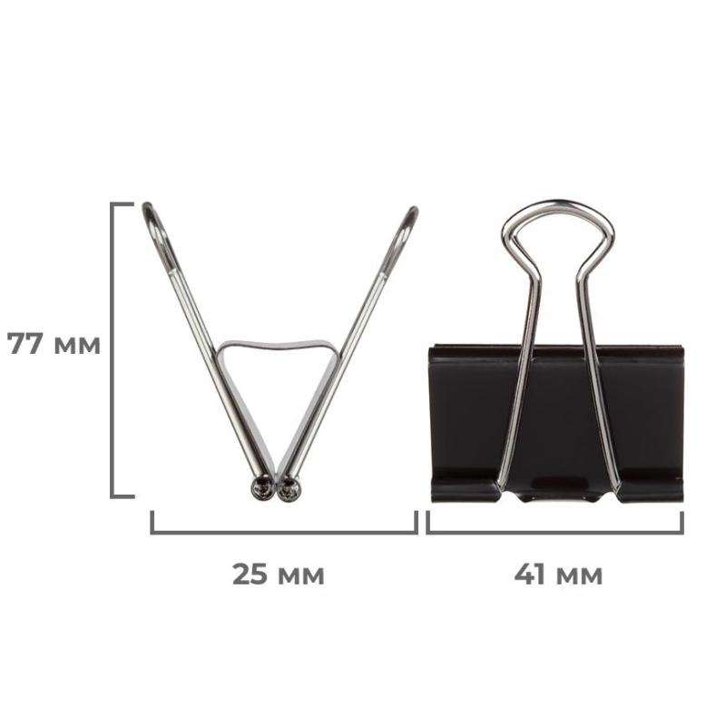 Зажимы для бумаг Комус 41 мм черные (12 штук в упаковке)<br><br>Металлические зажимы для бумаг Комус используются для скрепления документов без использования степлеров. Зажимы из металла с чёрным покрытием. Размер зажима: ширина 41 мм, высота 77 мм, глубина закладки 25 мм. Позволяет скреплять до 200 листов плотностью 80 г/кв.м, не деформируя при этом бумагу. Зажимы для бумаг поставляются по 12 штук в картонной упаковке. В транспортном коробе 36 упаковок. Зажимы Комус — это надёжное скрепление документов. Зажимы мягко скрепляют большое количество листов, не оставляя следов после удаления и не повреждая бумагу.<br><br>Для эффективного скрепления максимально допустимого объёма листов бумаги необходимо, чтобы листы были собраны в ровную стопку без заломов, загибов и дефектов поверхности бумаги.