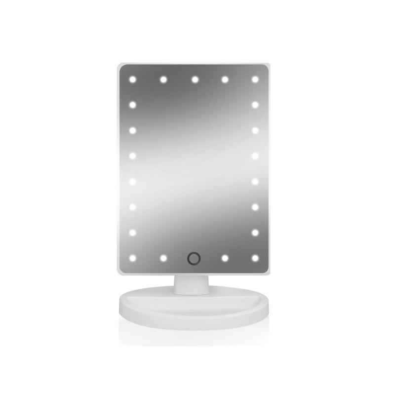 Зеркало косметическое Camelion M145-SL с подсветкой<br><br>Предназначено для нанесения макияжа и проведения косметических процедур. Оно обеспечивает высокую чёткость деталей благодаря качественному покрытию и встроенной светодиодной подсветке. Эта подсветка устраняет тени и создаёт яркое, ровное освещение.<br>Зеркало имеет толщину 2 мм и изготавливается из стекла с алюминиевым покрытием. Встроенные 21 светодиода дневного свечения (6000 К) позволяют настраивать яркость. Питание осуществляется от 4 элементов питания типа AA, которые устанавливаются в отсек на задней поверхности зеркала.<br>Корпус выполнен из прочного ABS-пластика. Управление осуществляется с помощью сенсорной кнопки. Зеркало имеет устойчивое основание в виде органайзера и компактные размеры (270×165×120 мм).<br>Упаковка включает зеркало, подставку и инструкцию. Зеркало подходит для всех типов кожи и обеспечивает комфортное освещение во время косметических процедур.