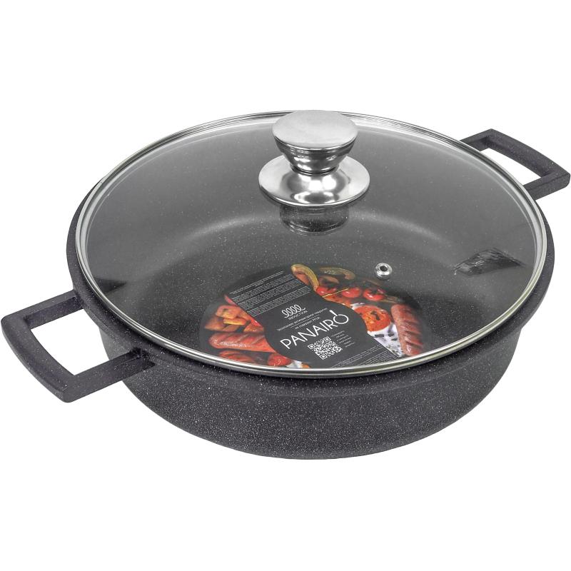 Предназначена для приготовления различных блюд, таких как жарка, тушение или обжаривание на высоких температурах. Она подходит для всех типов плит, включая индукционные. <br><br>Основные особенности и преимущества: <br>1. Благодаря большому диаметру (28 см) и объёму (4 л), в ней удобно перемешивать. Безупречно подходит для тушения и томления. <br>2. В комплект входит стеклянная крышка, точно подходящая по размеру. Для правильной циркуляции воздуха на ней есть паровыпускное отверстие. На крышке устойчивая к износу ручка из нержавеющей стали, которую приятно держать в руке. <br>3. Удобные литые алюминиевые ручки, расположенные по бокам, благодаря материалу изготовления никогда не сломаются. Посуда имеет высокую стойкость к деформациям и внешним повреждениям. <br>4. Если снять крышку, то жаровня превратится в удобную посуду для запекания. <br>5. Стенки высокие (8 см) и толстые: они лучше распределяют тепло, позволяют использовать разные температурные режимы с наибольшим эффектом, а также предотвращают попадание частичек еды за пределы жаровни. Это позволит надолго сохранить чистоту кухни. <br>6. Толщина дна составляет 5 мм, что исключает деформацию корпуса жаровни, гарантирует её долговечность, идеально распределяет нагрев по всей поверхности, обеспечивая длительное сохранение тепла, благодаря чему еда не пригорает и равномерно доходит до готовности. <br>7. Жаровня произведена из литого алюминия. Это говорит о том, что посуда прослужит долгое время, гарантируя прочность и качество.<br>8. Безопасное (не содержит PFOA и PTFE), пятислойное усиленное антипригарное покрытие, нанесённое методом напыления, во много раз лучше, чем покрытия по методу «наката», сохраняет антипригарные свойства на долгие годы и не выделяет вредных веществ. Посуда, произведённая методом напыления, служит намного дольше. <br>9. Можно мыть в режиме «Эко» в посудомоечной машине. <br>10. Подходит для использования на газовых и электрических плитах, на стеклокерамических, индукционных, газовых варочных поверхностях, на галогеновых конфорках. <br>11. Мраморный чёрный цвет будет отлично смотреться на фоне любого интерьера. Благодаря этому цвету даже после многократного использования жаровня будет долго выглядеть как новая. <br><br>Перед первым использованием удалить все этикетки и упаковочные материалы, тщательно вымыть посуду тёплой мыльной водой и тщательно ополоснуть, смазать всю внутреннюю поверхность тонким слоем растительного масла. Не нагревать пустую посуду, не подвергать горячую посуду резкому охлаждению, недопустимо скольжение посуды по рабочей поверхности плиты и стола. Во избежание царапин ставьте посуду только на чистую плиту. Во время приготовления избегайте попадания соли/сахара на поверхность плиты. Рекомендуем использовать практичные кухонные приборы из силикона и дерева — они способствуют продлению срока службы посуды.